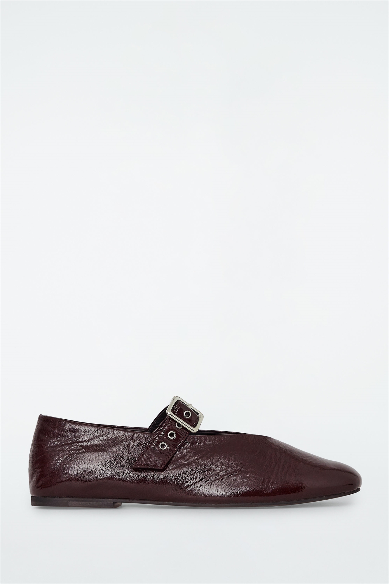 Отталкиваясь от стиля из архивов COS, команда женской одежды переосмыслила культовые Mary-Janes для предстоящего сезона. Эти современные балетки из лакированной кожи насыщенного бордового цвета с миндалевидным носком и мягкой стелькой удобны для ношения в течение всего дня. Серебристые люверсы и пряжки обеспечивают тонкий контраст. Застежка на пряжке COS поддерживает ответственное производство через Leather Working Group Верх, подкладка и подошва: 100% кожа. За исключением отделки