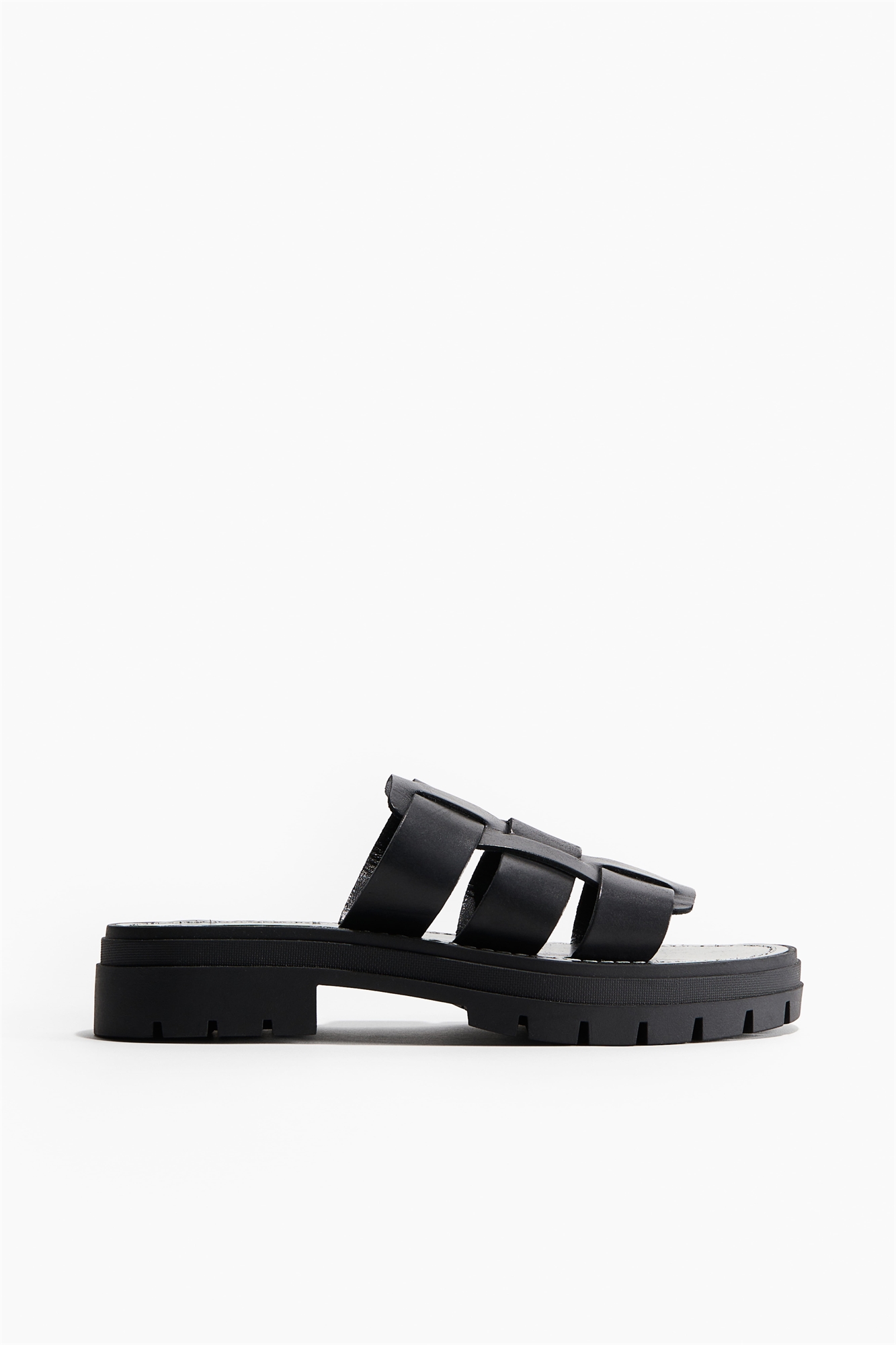 Сандалии из мягкой кожи с открытыми закругленными носками и широким плетеным ремешком. Толстая подошва и низкий каблук с узором.
