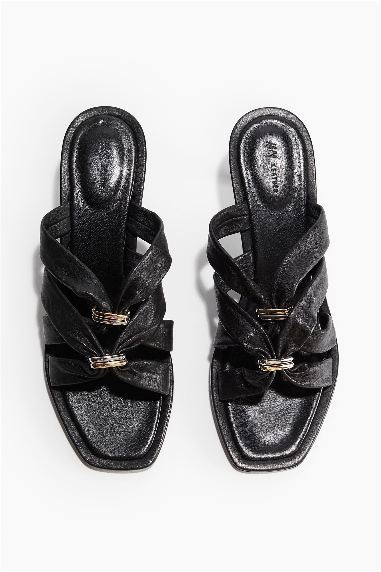 Сандалии на каблуке из кожи с открытым носком и мягкими ремешками, соединенными блестящими металлическими петлями. Кожаные стельки.