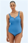 Полностью закрытый купальник с квадратным вырезом и V-образным отверстием спереди. Широкие бретели и чашечки со съемными вкладышами, которые формируют бюст и обеспечивают хорошую поддержку. Сборки по бокам для лучшей посадки на животике и среднее покрытие сзади.