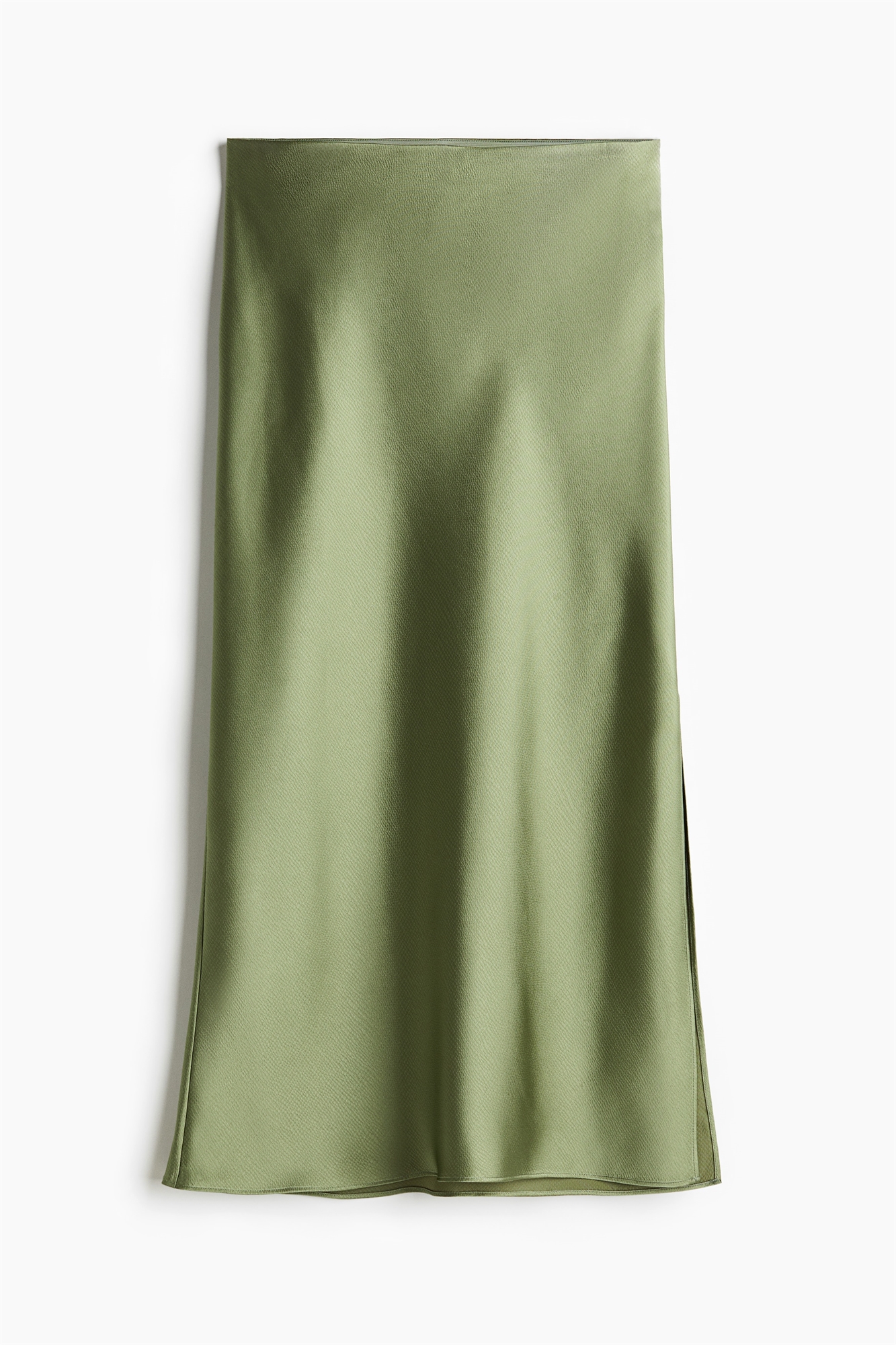 Длинная юбка-слип из крепового атласа с заниженной талией, скрытой эластичной резинкой и потайной застежкой на молнию и пуговицу с одной стороны. Подол прямого покроя с разрезом с одной стороны. Без подкладки.