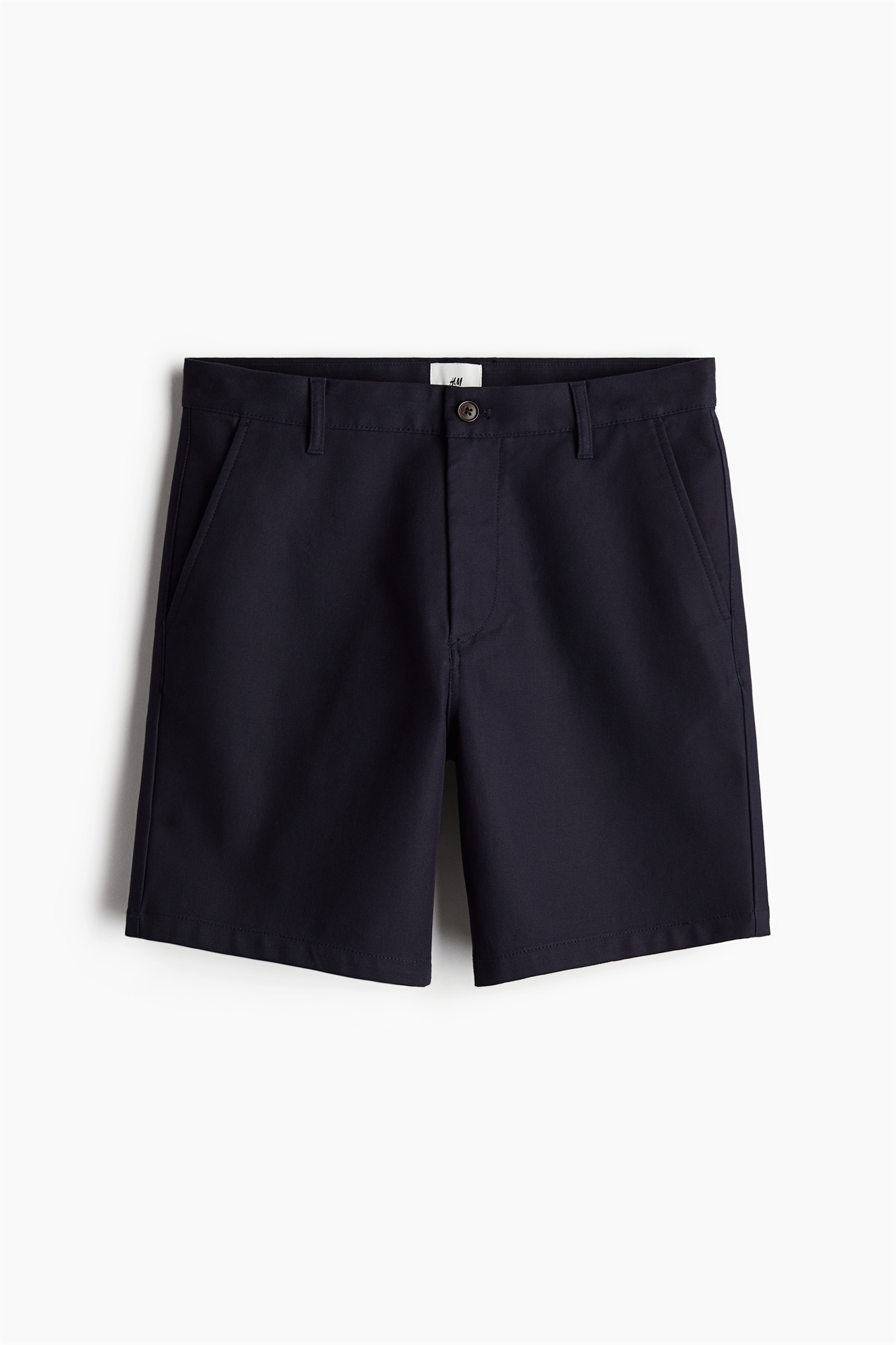 Шорты-чинос из мягкой хлопковой саржи с ширинкой на молнии и пуговице, диагональными боковыми карманами и накладными карманами с пуговицей сзади. Регулярный крой для комфортной носки и классического силуэта.