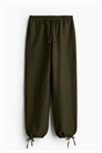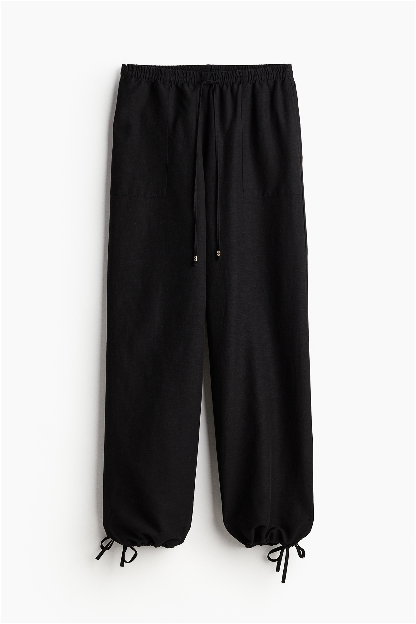 Свободные брюки с воздушным плетением из смеси льна. Регулярная талия с эластичной отделкой и узким шнурком с бусинами на концах. Накладные боковые карманы и прямые ноги с утягивающим шнурком на подоле.