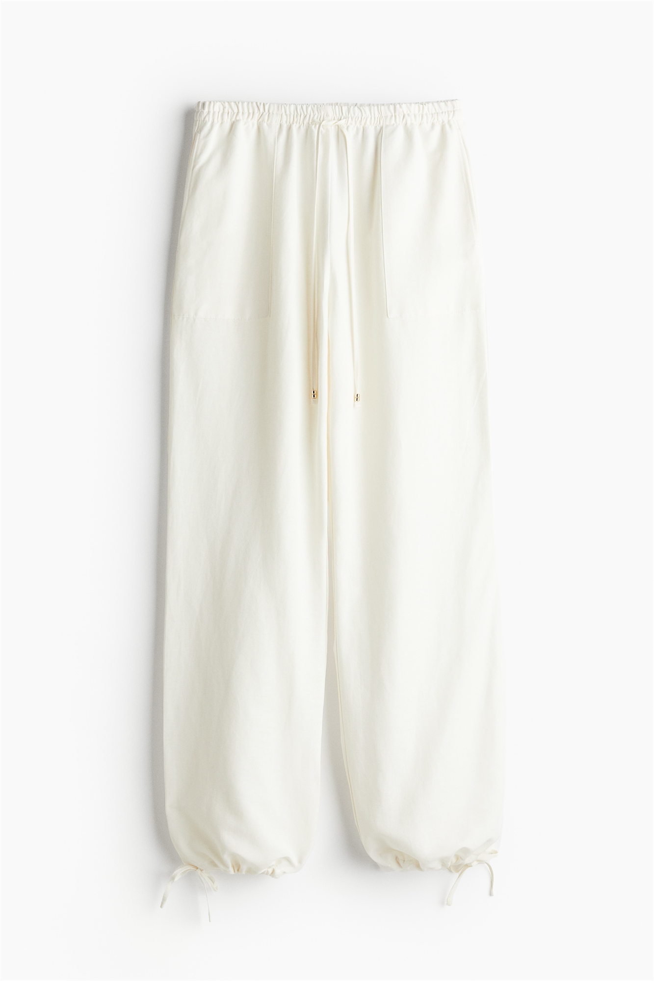 Свободные брюки с воздушным плетением из смеси льна. Регулярная талия с эластичной отделкой и узким шнурком с бусинами на концах. Накладные боковые карманы и прямые ноги с утягивающим шнурком на подоле.