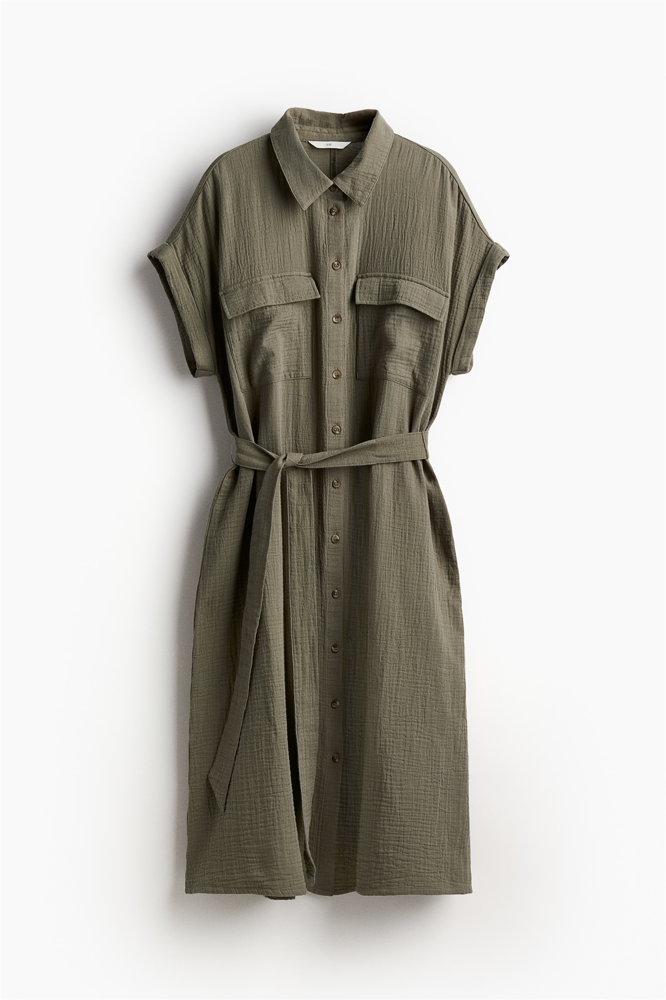 Платье-рубашка длиной до колен из хлопкового полотна с воротником, пуговицами спереди и широким съемным поясом-галстуком на талии. Короткие рукава с отворачивающимися манжетами и накладные нагрудные карманы с клапаном. Без подкладки.