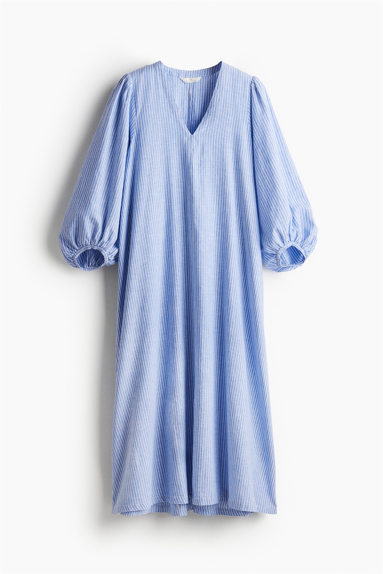 Свободное платье длиной до колен из воздушной ткани с V-образным вырезом и длинными рукавами-баллончиками с узкой окантовкой на манжетах. Без подкладки.