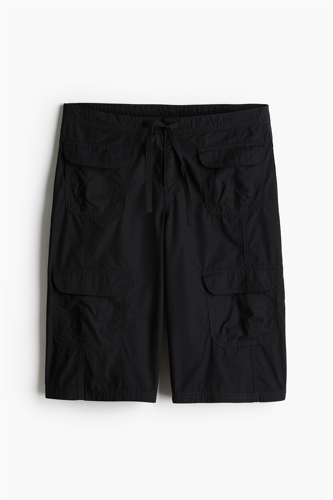 Шорты длиной до колена из хлопкового полотна с заниженной талией и утягивающим шнурком, ширинкой на молнии и скрытой застежкой на крючок и планку. Накладные карманы спереди и на ногах и незаметные задние карманы.