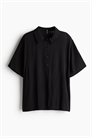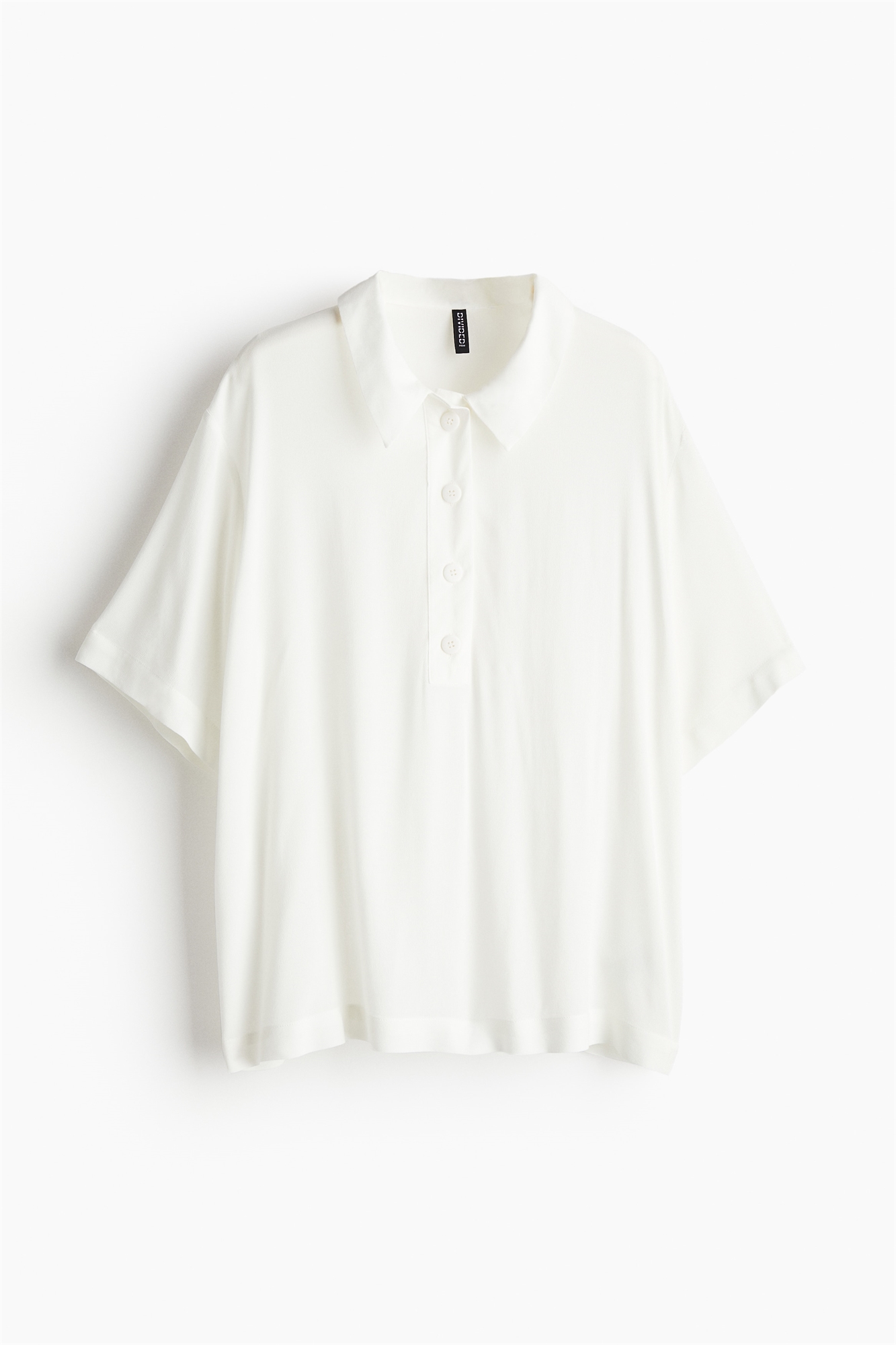 Рубашка-поло из прозрачного вискозного крепа с воротником и застежкой на пуговицы. Свободный крой с опущенными плечами и короткими рукавами, заканчивающимися чуть выше локтей. Без подкладки.