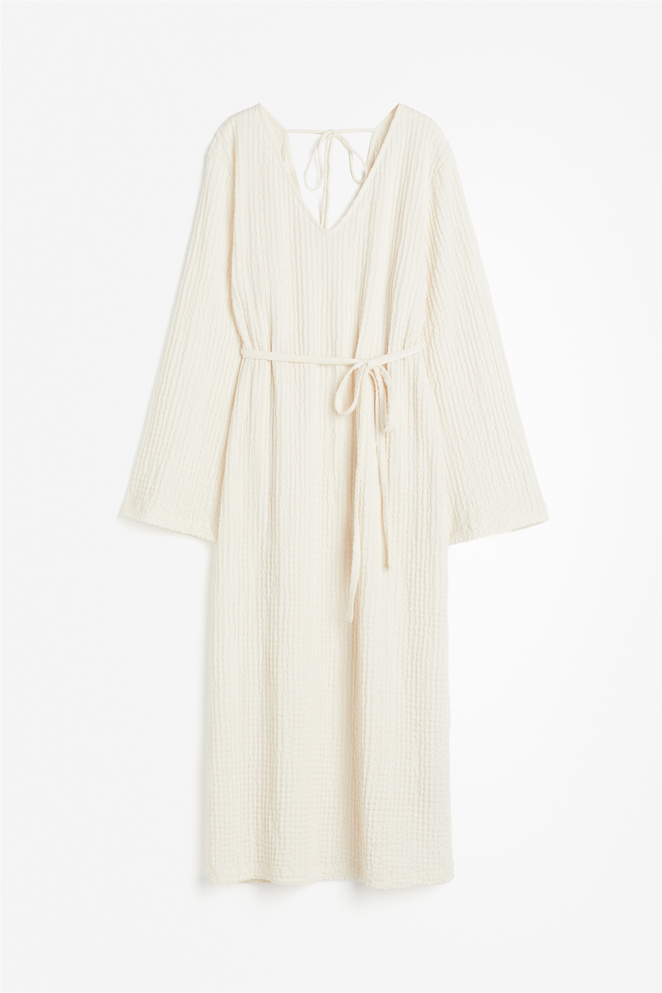 Платье свободного покроя из мятого джерси длиной до колен с V-образным вырезом горловины с узкими завязками сзади и длинными рукавами. Узкий съемный пояс-завязка на талии.
