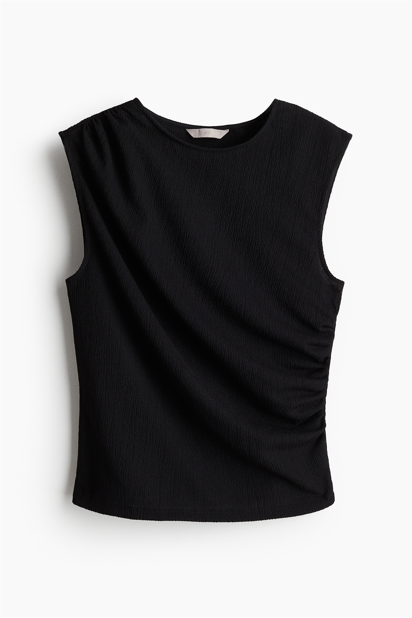Приталенный жилет-топ из фактурного джерси с круглым вырезом и сборками на одном плече и по бокам для придания силуэту мягкой драпировки.
