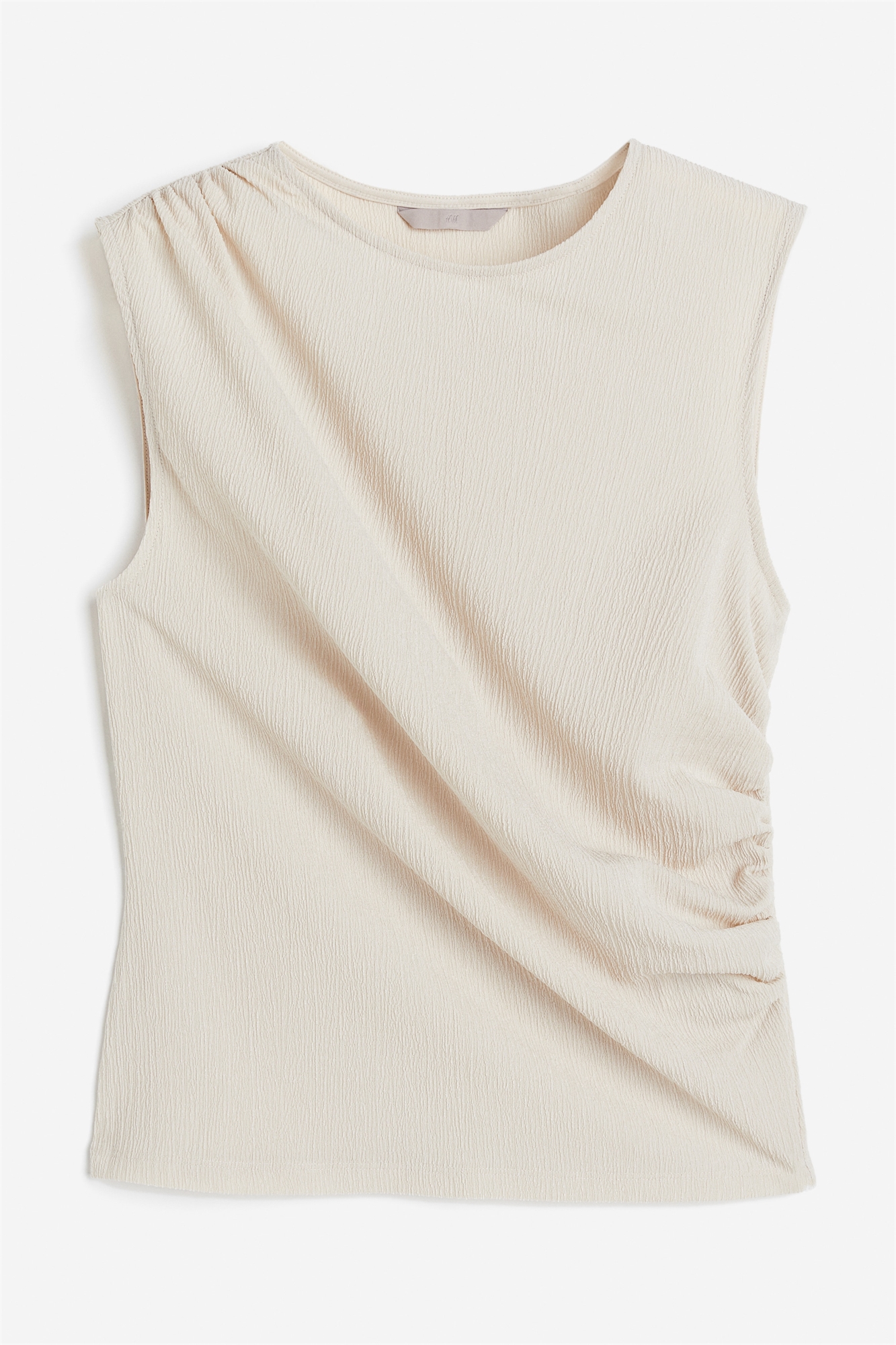 Приталенный жилет-топ из фактурного джерси с круглым вырезом и сборками на одном плече и по бокам для придания силуэту мягкой драпировки.
