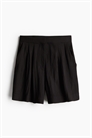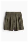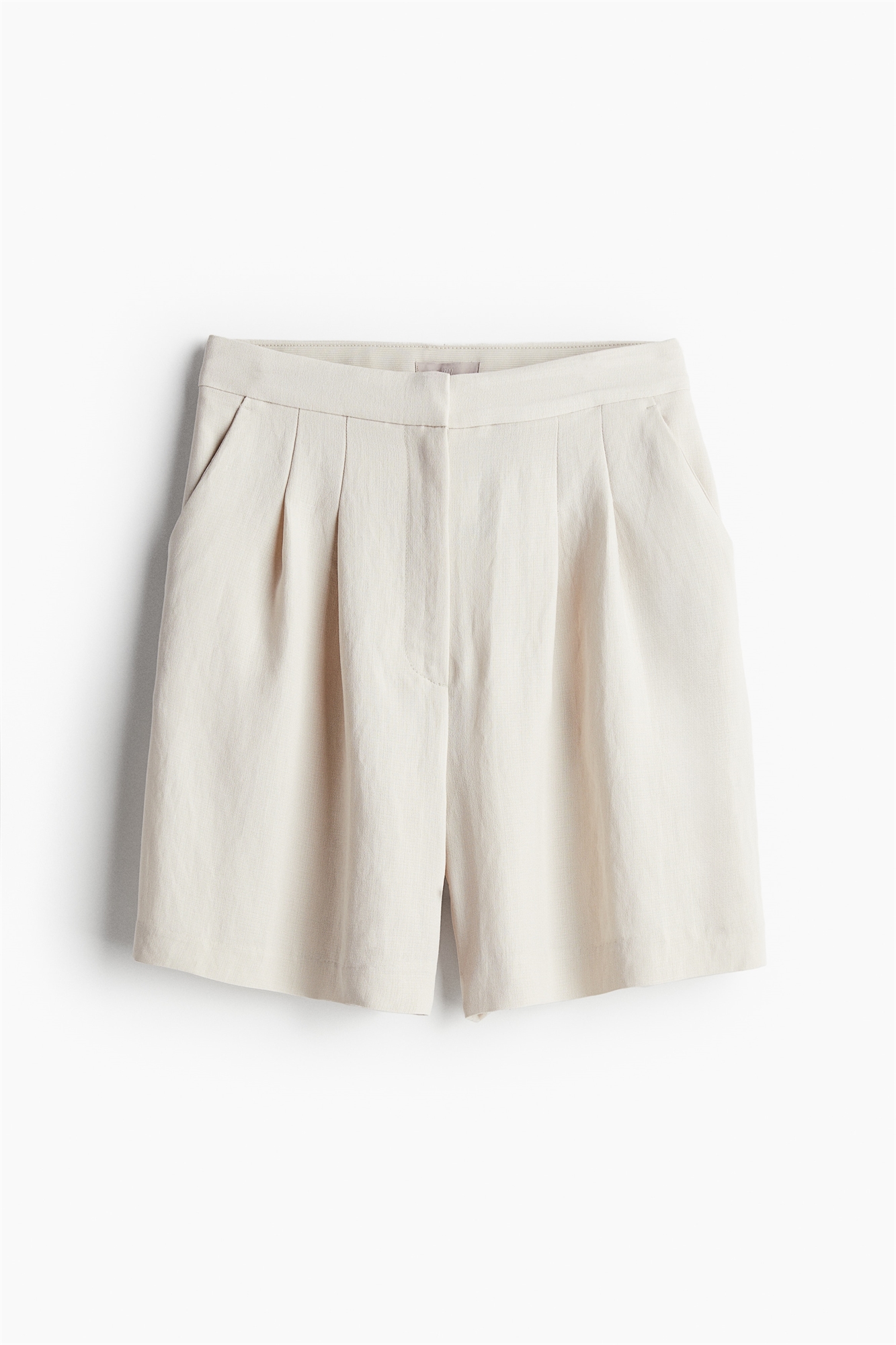 Шорты из тканого материала с высокой талией, ширинкой на молнии и скрытой застежкой на пуговицы и крючки. Свободный крой со складками спереди, диагональными боковыми карманами и втачными карманами сзади.