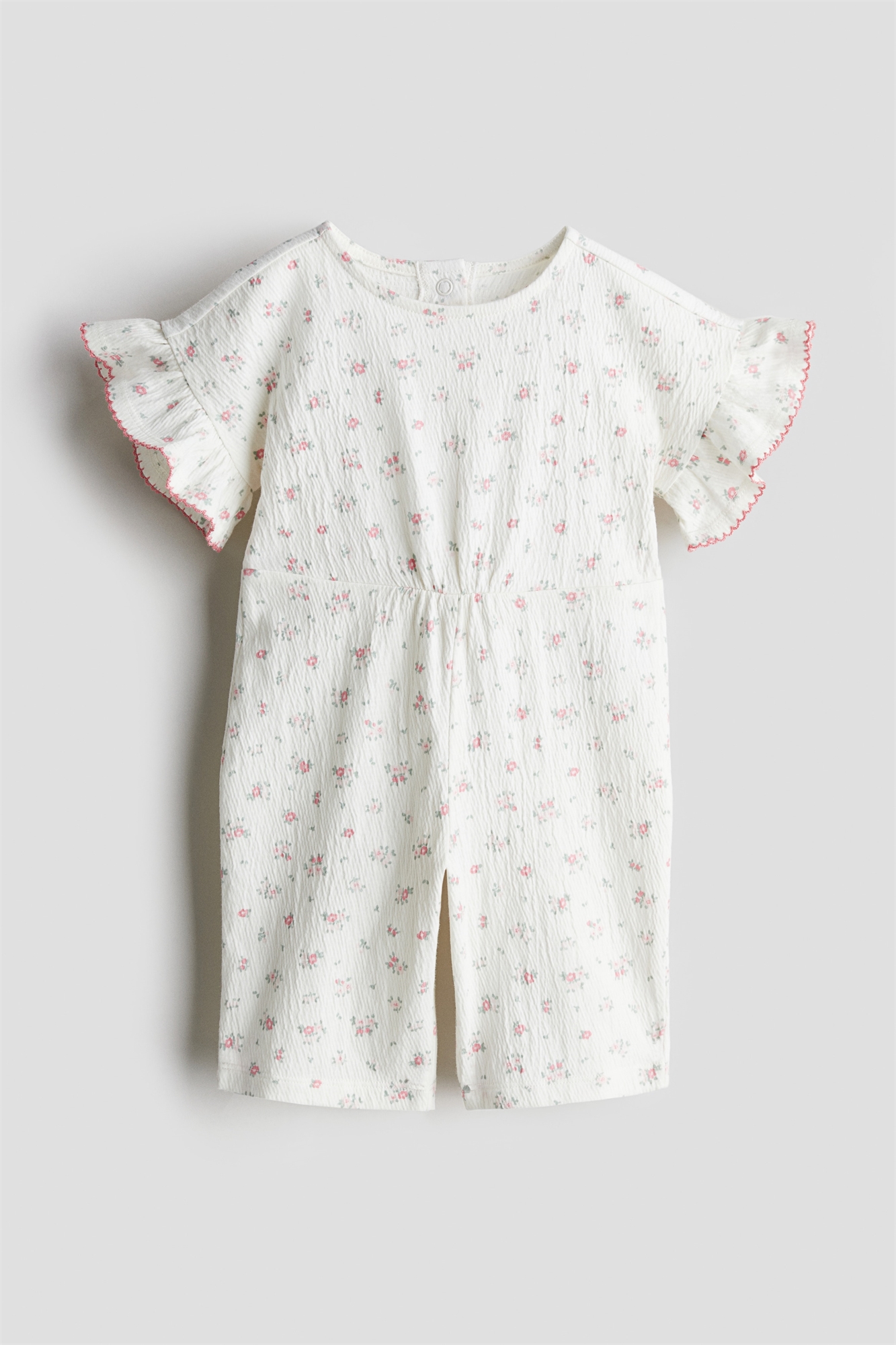 Ромпер из мягкой хлопковой ткани с принтом на всю длину. Круглый вырез, застежки сзади и короткие рукава с манжетами с оборками. Эластичный притачной шов спереди и прямые широкие ноги.