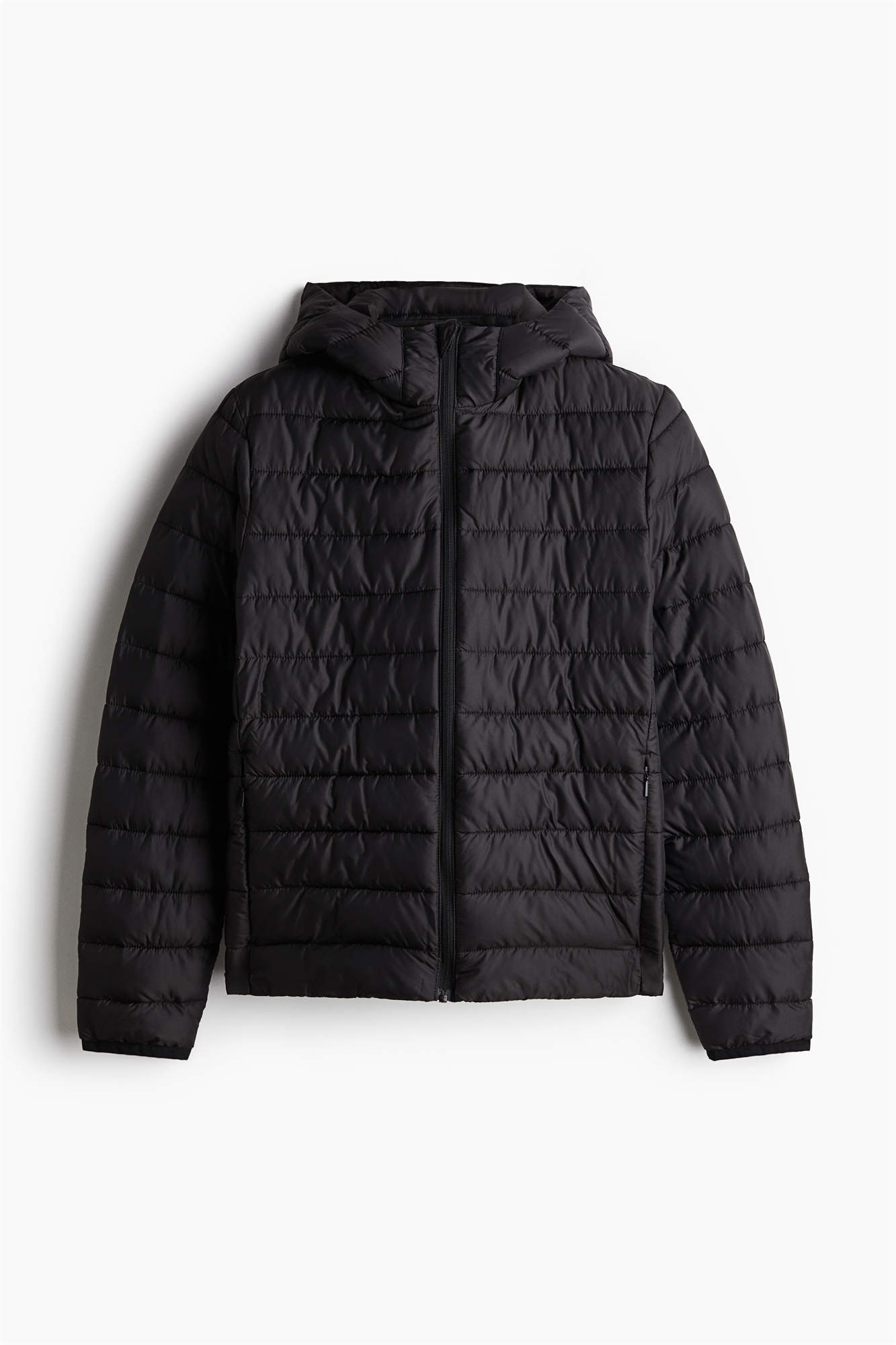 Легкая пуховая куртка из стеганого полотна с капюшоном и застежкой-молнией спереди с защитой подбородка от натирания. Длинные рукава и карманы в боковых швах с потайной застежкой-молнией. Эластичная резинка на манжетах. Зауженный крой, облегающий контуры тела и создающий приталенный силуэт. Без подкладки.