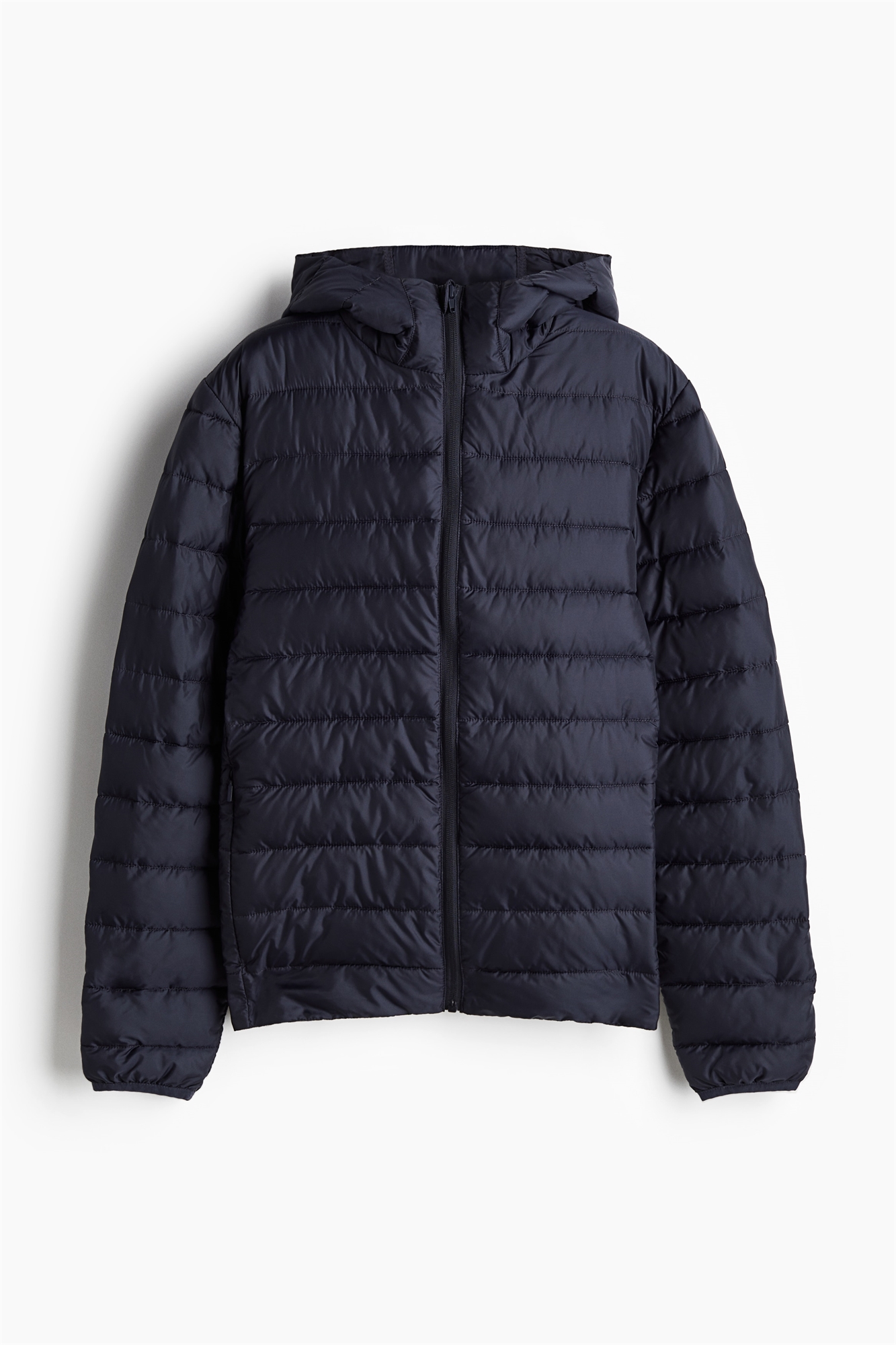 Легкая пуховая куртка из стеганого полотна с капюшоном и застежкой-молнией спереди с защитой подбородка от натирания. Длинные рукава и карманы в боковых швах с потайной застежкой-молнией. Эластичная резинка на манжетах. Зауженный крой, облегающий контуры тела и создающий приталенный силуэт. Без подкладки.
