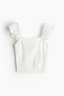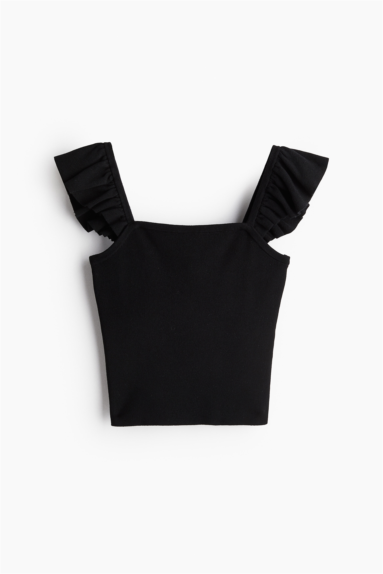 Приталенный топ из тонкого трикотажа в рубчик с квадратным вырезом спереди и сзади и рукавами-воланами с потайной резинкой на плечах.