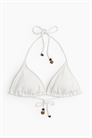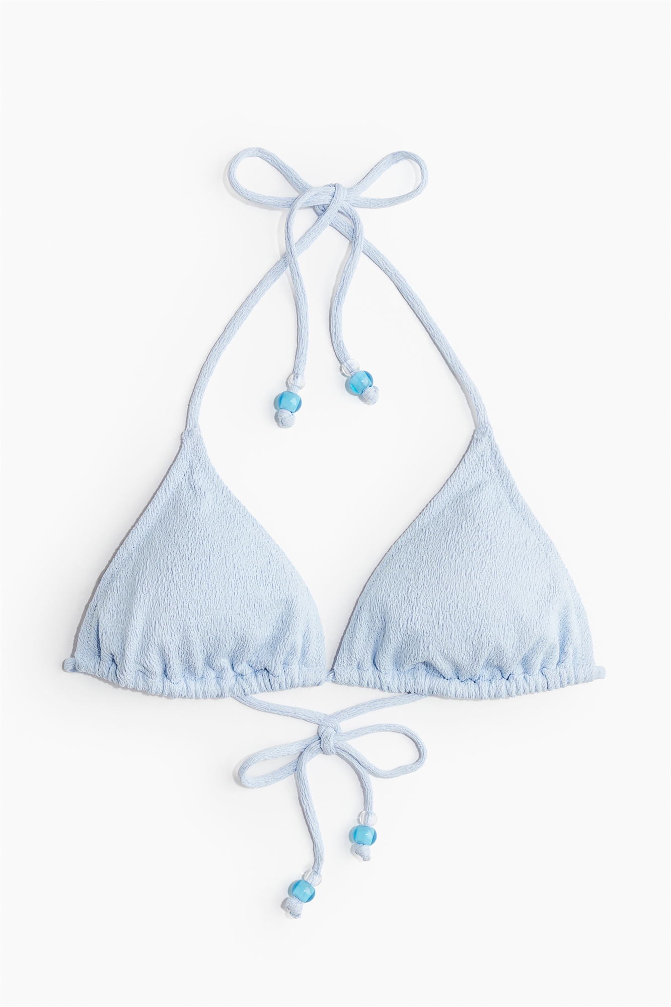 Треугольный бикини-топ без подкладки с чашечками со съемными вкладышами, придающими форму бюсту и обеспечивающими хорошую поддержку. Завязки с бусинами сзади и на шее.