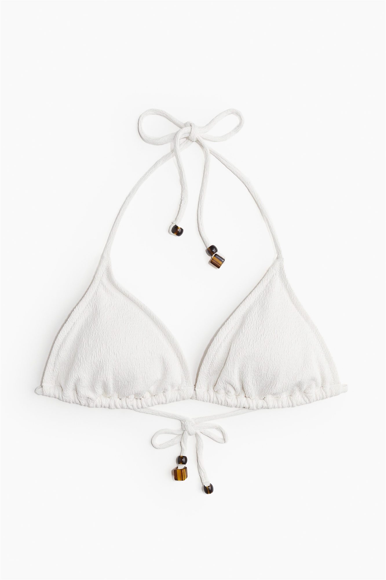Треугольный бикини-топ без подкладки с чашечками со съемными вкладышами, придающими форму бюсту и обеспечивающими хорошую поддержку. Завязки с бусинами сзади и на шее.