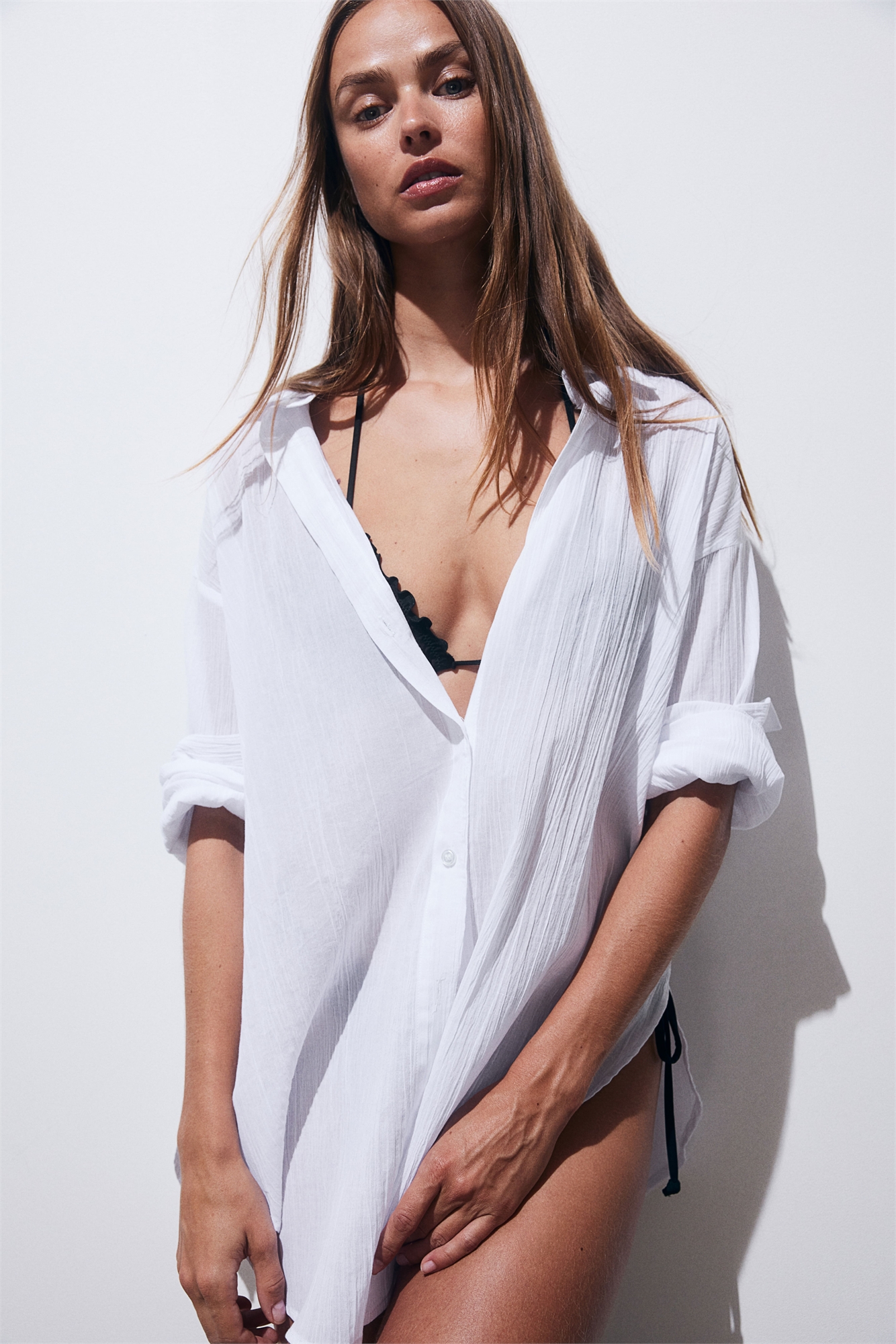 Длинная рубашка из воздушного хлопкового полотна с воротником и пуговицами спереди. Свободный крой с опущенными плечами и длинными рукавами с манжетами на пуговицах. Закругленный подол.