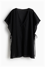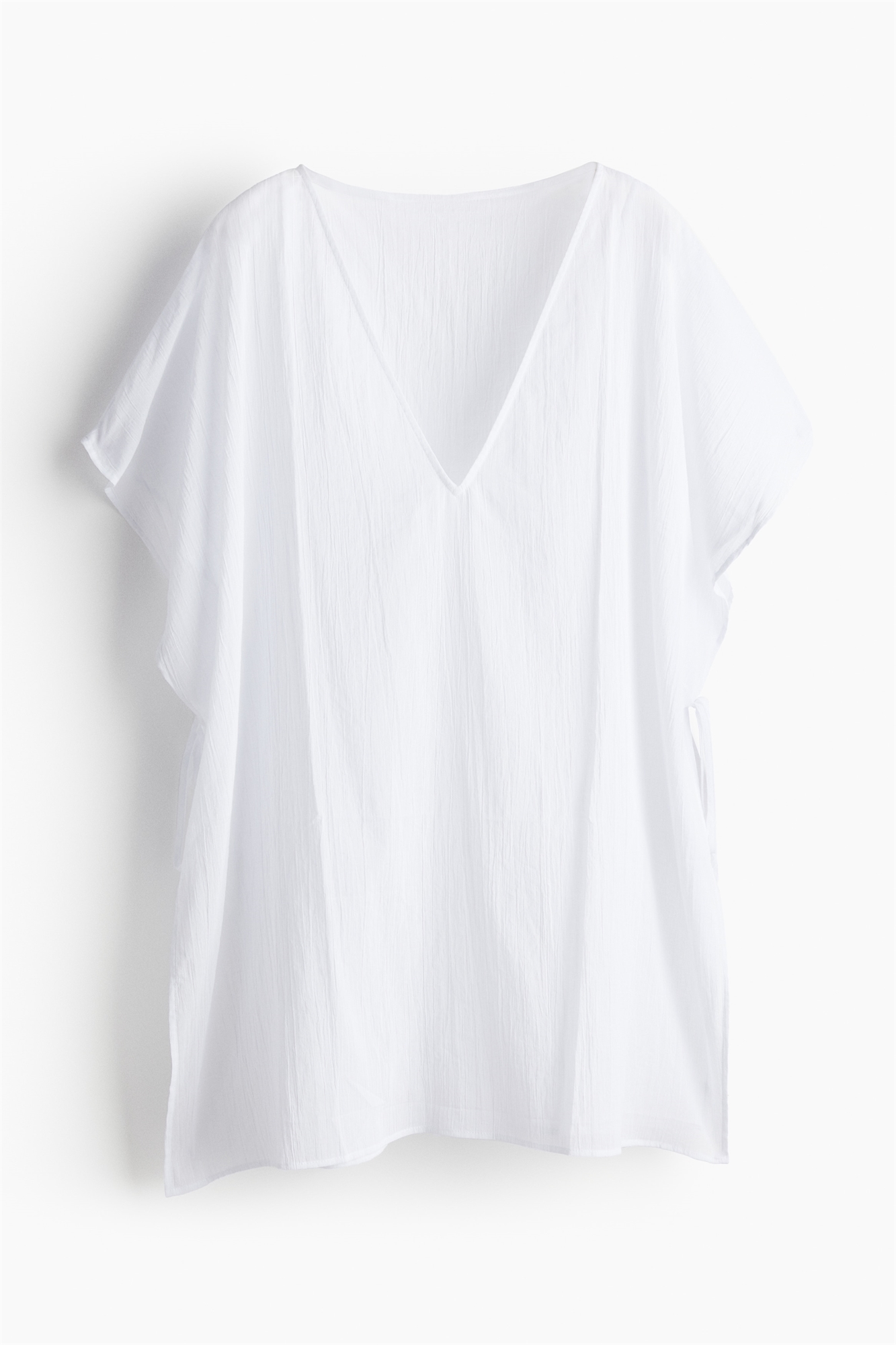 Короткий пляжный кафтан больших размеров из воздушного хлопка. Глубокий V-образный вырез, короткие широкие рукава и открытые бока с узкими завязками.