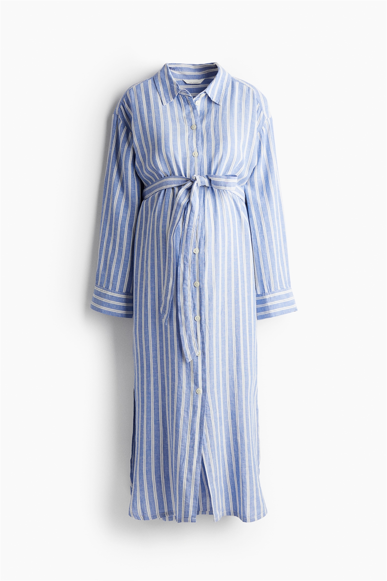 Платье-рубашка длиной до колен из воздушной ткани из смеси льна. Воротник, застежка на пуговицы спереди, двухслойный ярморочный воротник сзади и длинные рукава с манжетами на пуговицах. Съемный пояс-завязка под бюстом и мягко изогнутый подол с разрезом с каждой стороны. Платье можно носить как во время, так и после беременности.