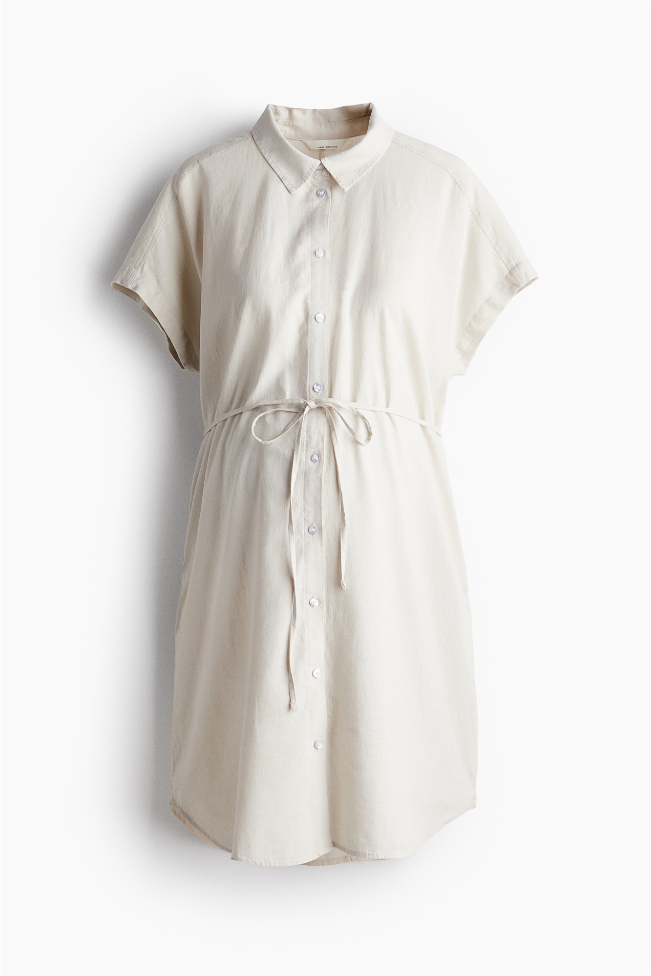 Короткое платье из смеси льна с воздушным плетением. Воротник, пуговицы спереди и короткие рукава. Узкий съемный пояс-завязка под бюстом и неброские боковые карманы. Закругленный подол. Платье можно носить как во время, так и после беременности.