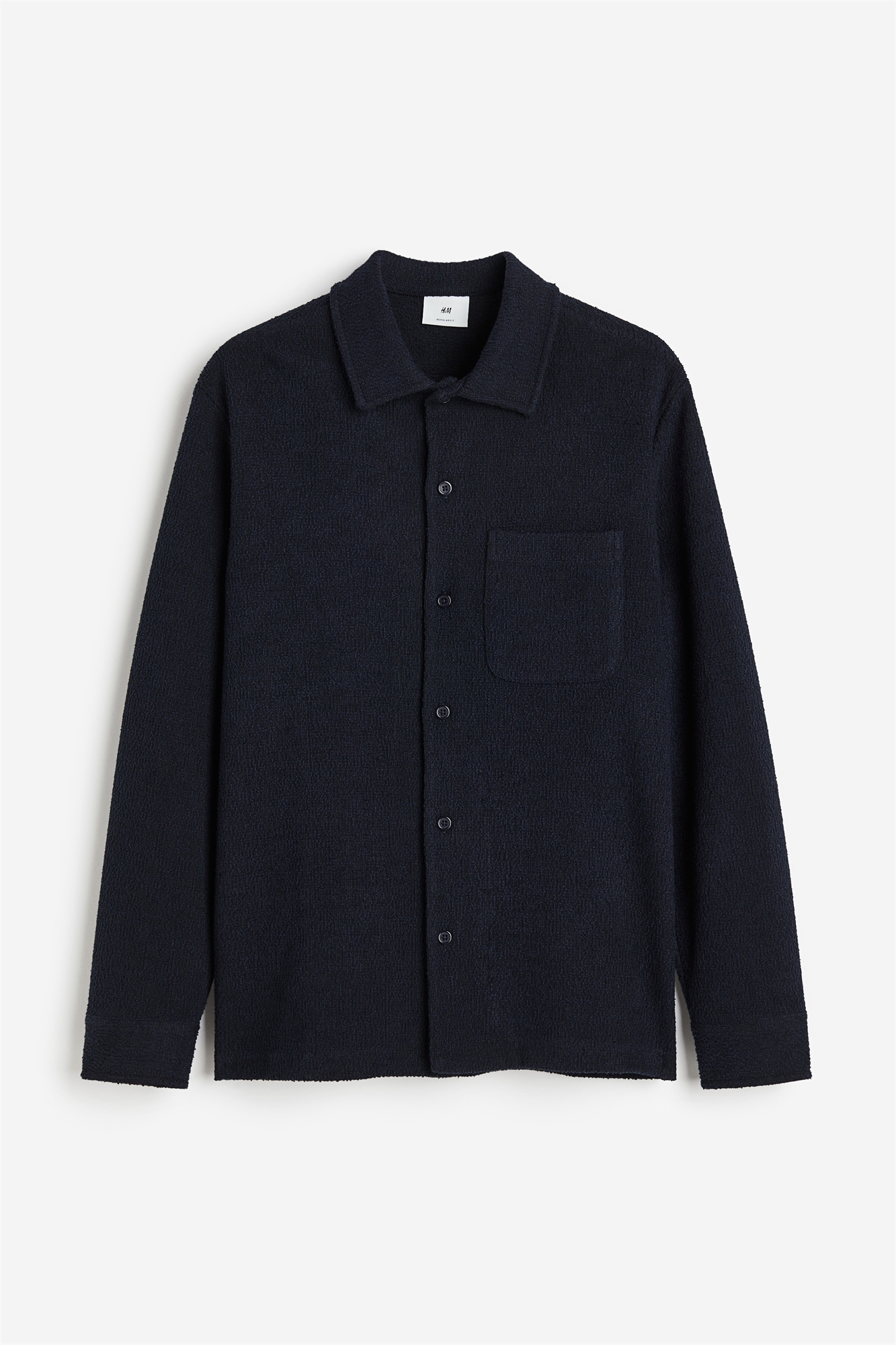 Рубашка из джерси букле с отложным воротником, французским передом, передом, передом и открытым нагрудным карманом. Длинные рукава, манжеты на пуговицах и прямой подол с разрезом с каждой стороны. Регулярный крой для комфортной носки и классического силуэта.