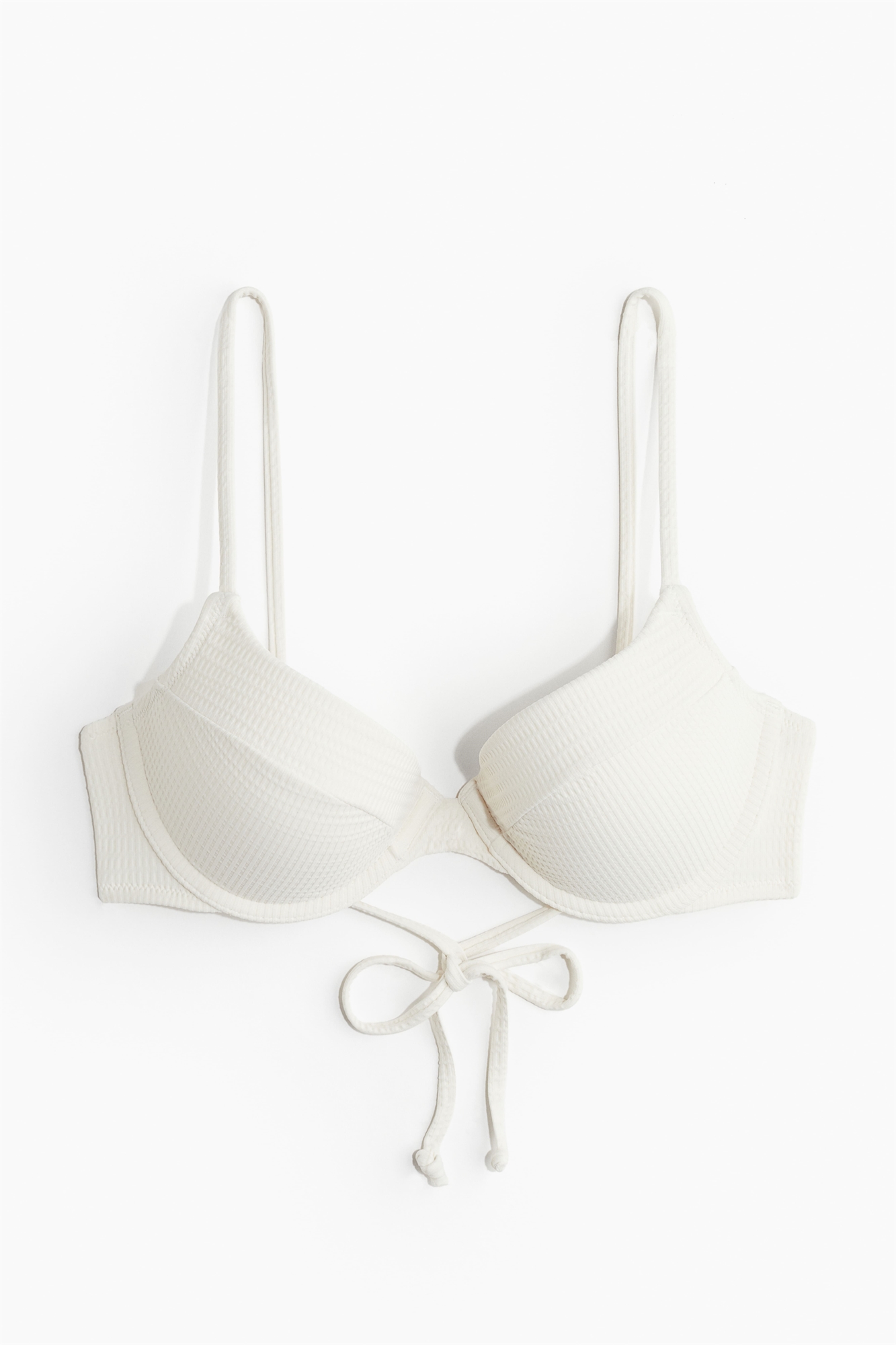 Бикини-топ на подкладке с мягкими чашечками для увеличения бюста и декольте. Регулируемые бретели и завязки сзади.