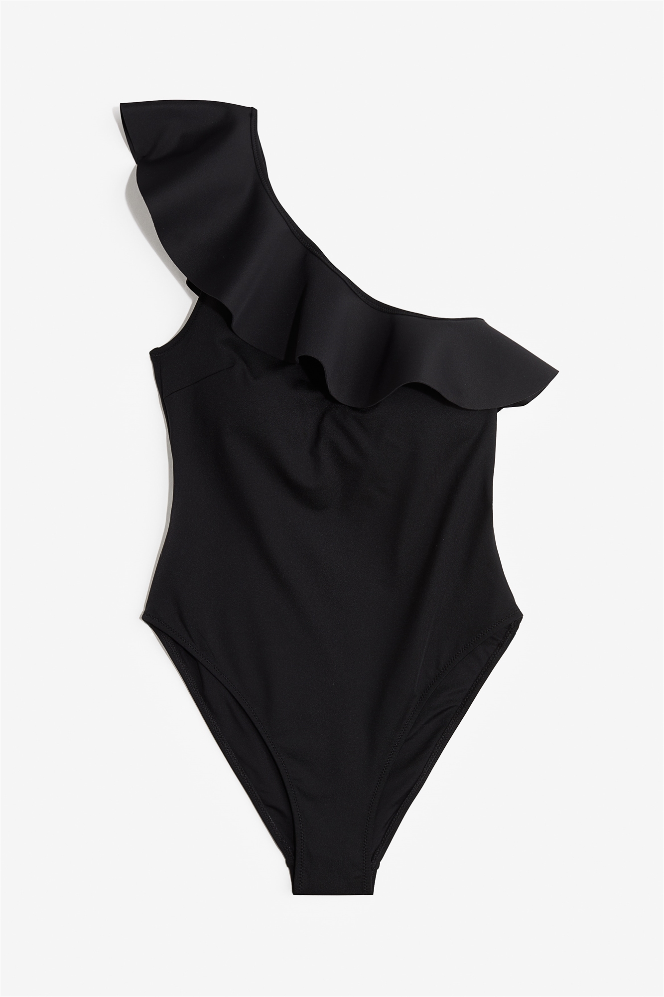 Полностью на подкладке, купальник на одно плечо с асимметричным вырезом и широким воланом в верхней части, переходящим на одно плечо. Чашечки со съемными вставками, придающими форму бюсту и обеспечивающими хорошую поддержку. Ноги с высоким вырезом и вырезом сзади.