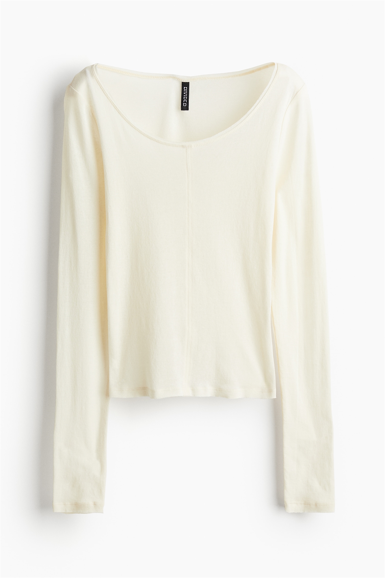 Облегающая рубашка из хлопкового джерси с глубоким круглым вырезом, длинными рукавами и прямым подолом.