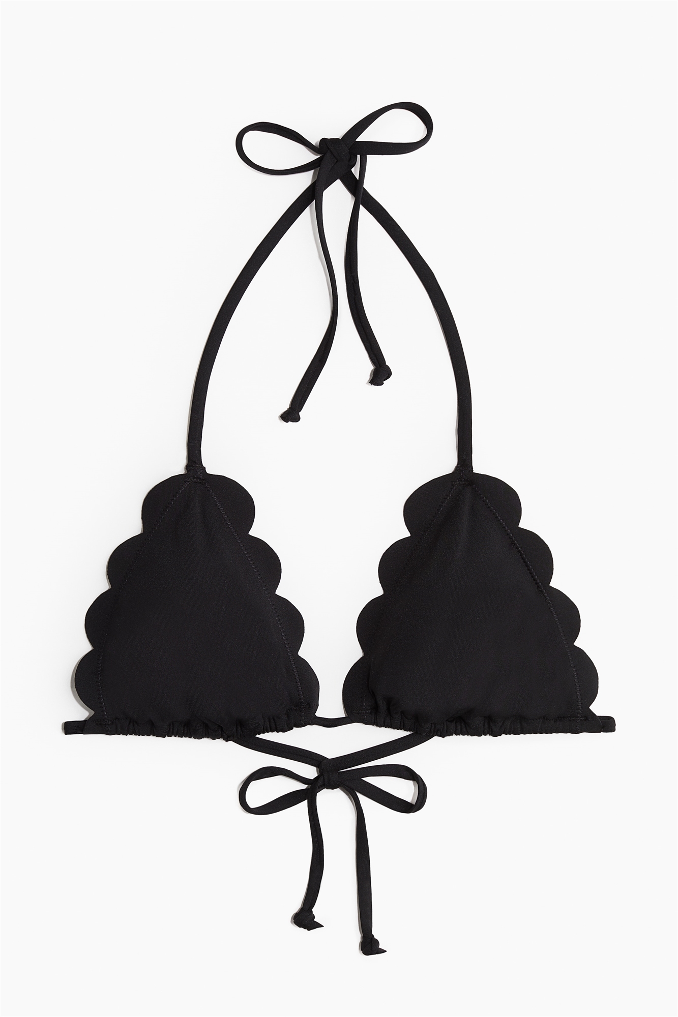 Бикини-треугольник на подкладке, без проводов, с приклеенными гребешками и чашечками со съемными вкладышами, придающими форму бюсту и обеспечивающими хорошую поддержку. Завязки сзади и на шее.