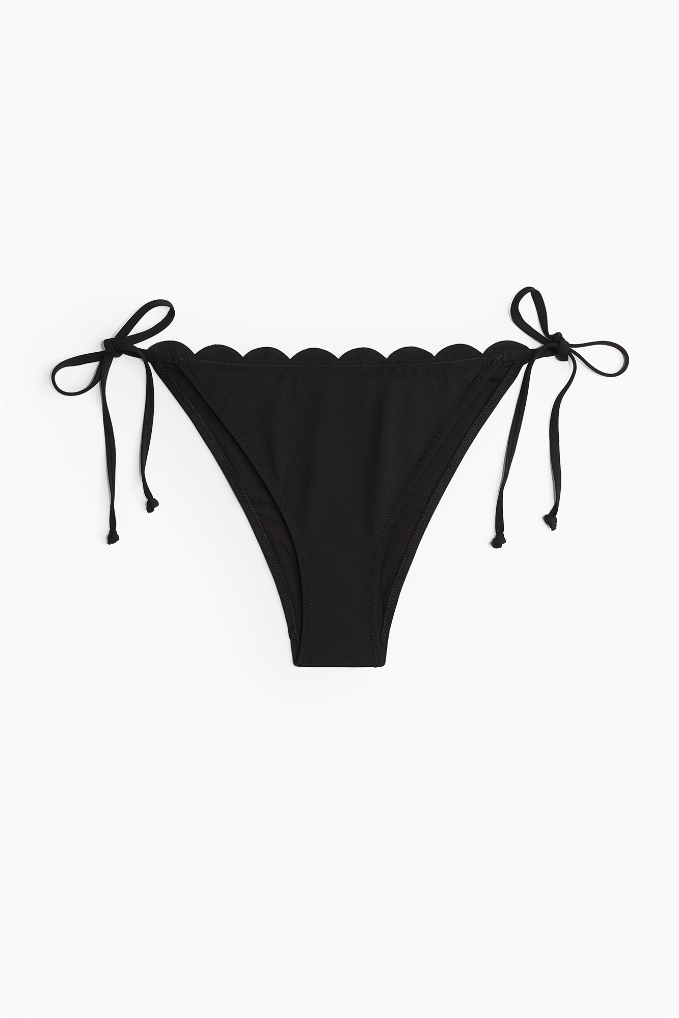 Трусики-бикини на подкладке, со средней талией и пришитым гребешком, с завязками по бокам и вырезом сзади.