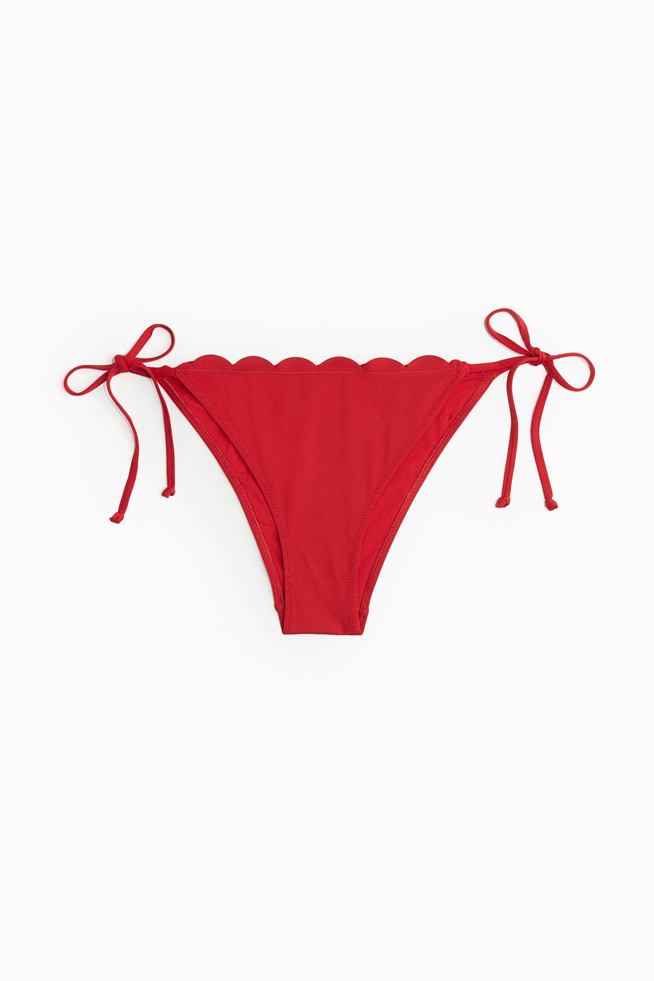 Трусики-бикини на подкладке, со средней талией и пришитым гребешком, с завязками по бокам и вырезом сзади.