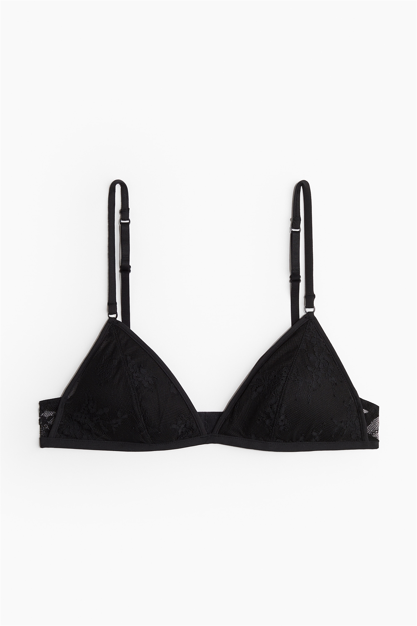Мягкий бюстгальтер без проводов из кружева с регулируемыми бретелями и чашечками из сетки со съемными вкладышами, которые придают форму бюсту и обеспечивают хорошую поддержку. Застежка на крючки и глазки сзади.