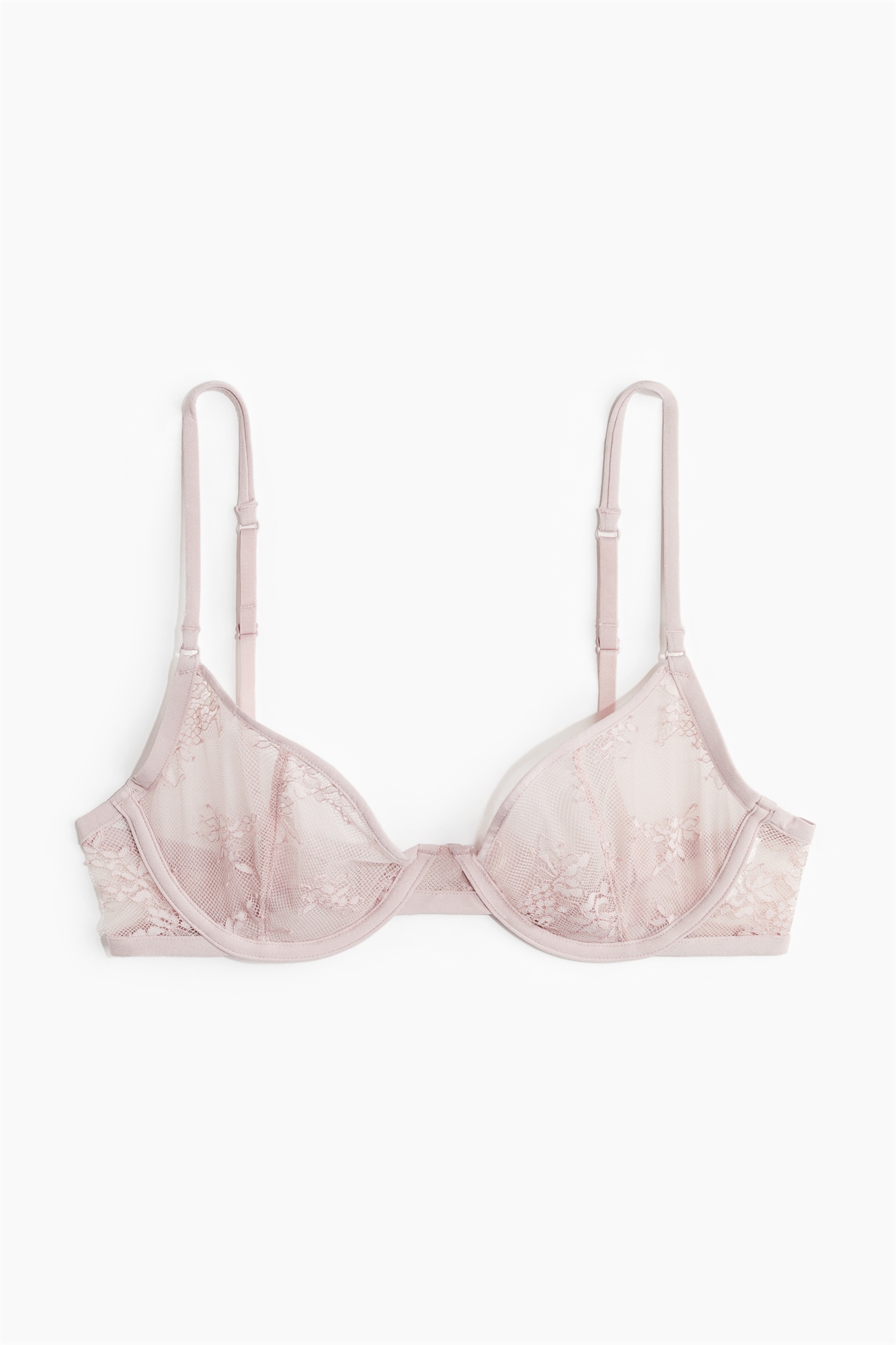 Кружевной бюстгальтер без подкладки с регулируемыми бретелями и чашечками с сетчатой подкладкой, которые придают бюсту естественную форму и обеспечивают легкую поддержку. Застежка на крючки и глазки сзади.