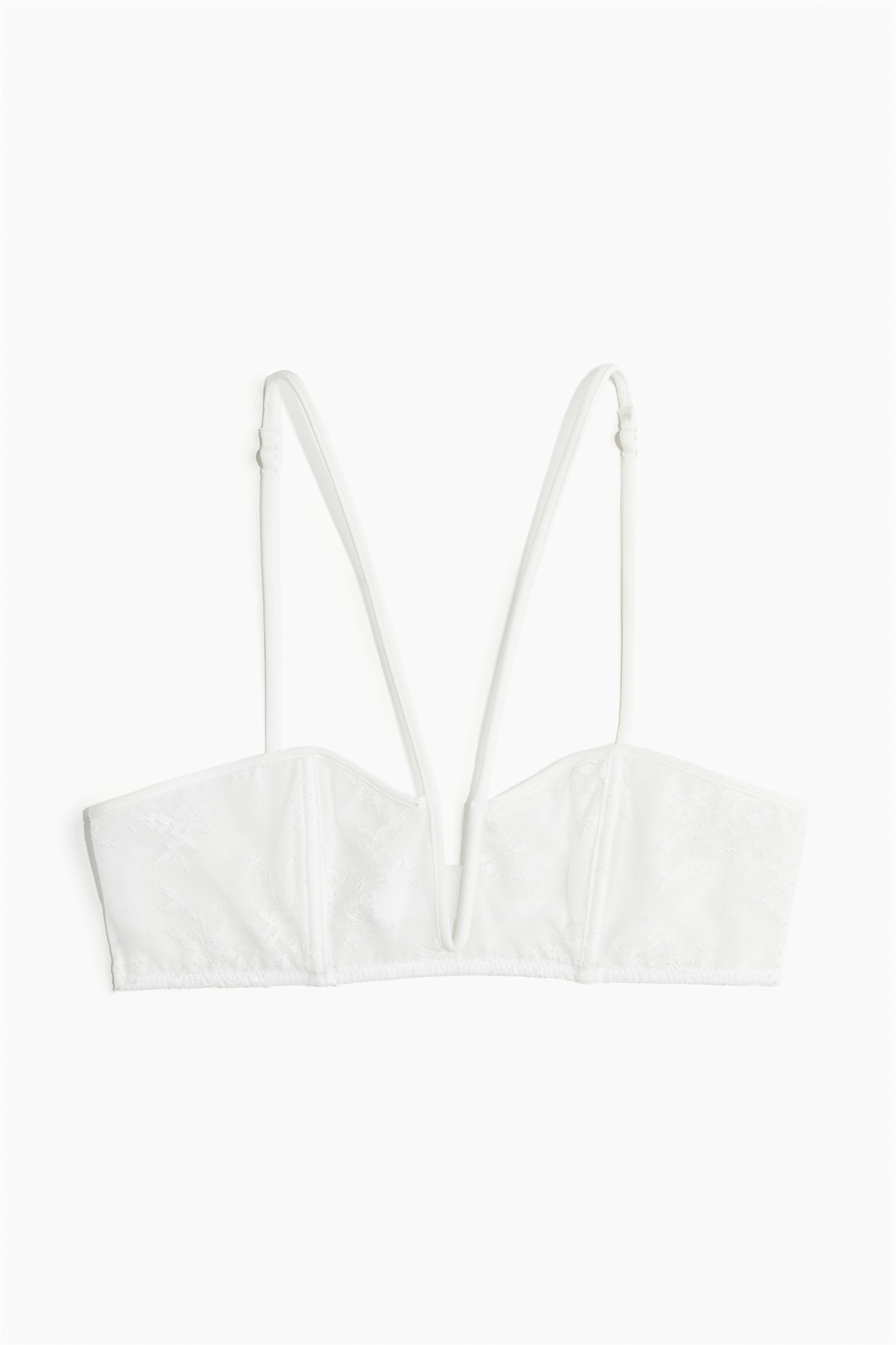 Мягкий бюстгальтер из кружева с косточками спереди, V-образной проволокой по центру бюста и узкими регулируемыми бретелями. Чашечки с сетчатой подкладкой придают бюсту естественную форму и обеспечивают легкую поддержку. Застежка на крючки и глазки сзади.