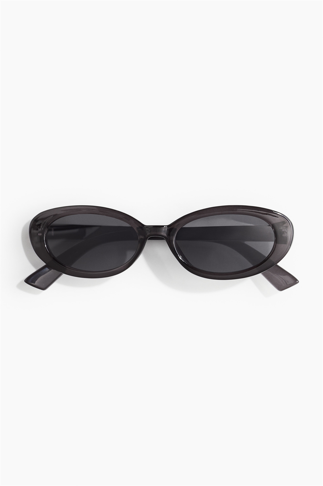 Овальные солнцезащитные очки с пластиковой оправой и боковыми дужками. Тонированные пластиковые линзы с УФ-защитой.