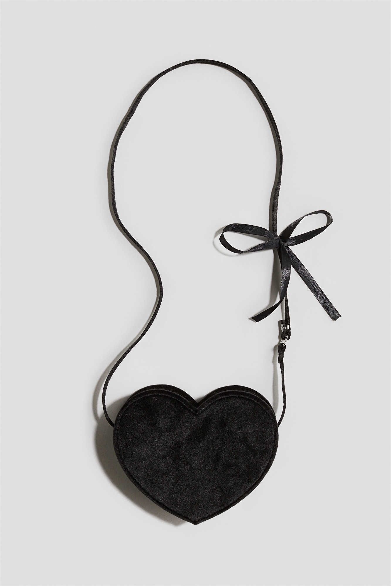 Сумка на плечо в форме сердца с застежкой на молнию сверху и узким плечевым ремнем с отрывной кнопкой на одном конце. На подкладке.