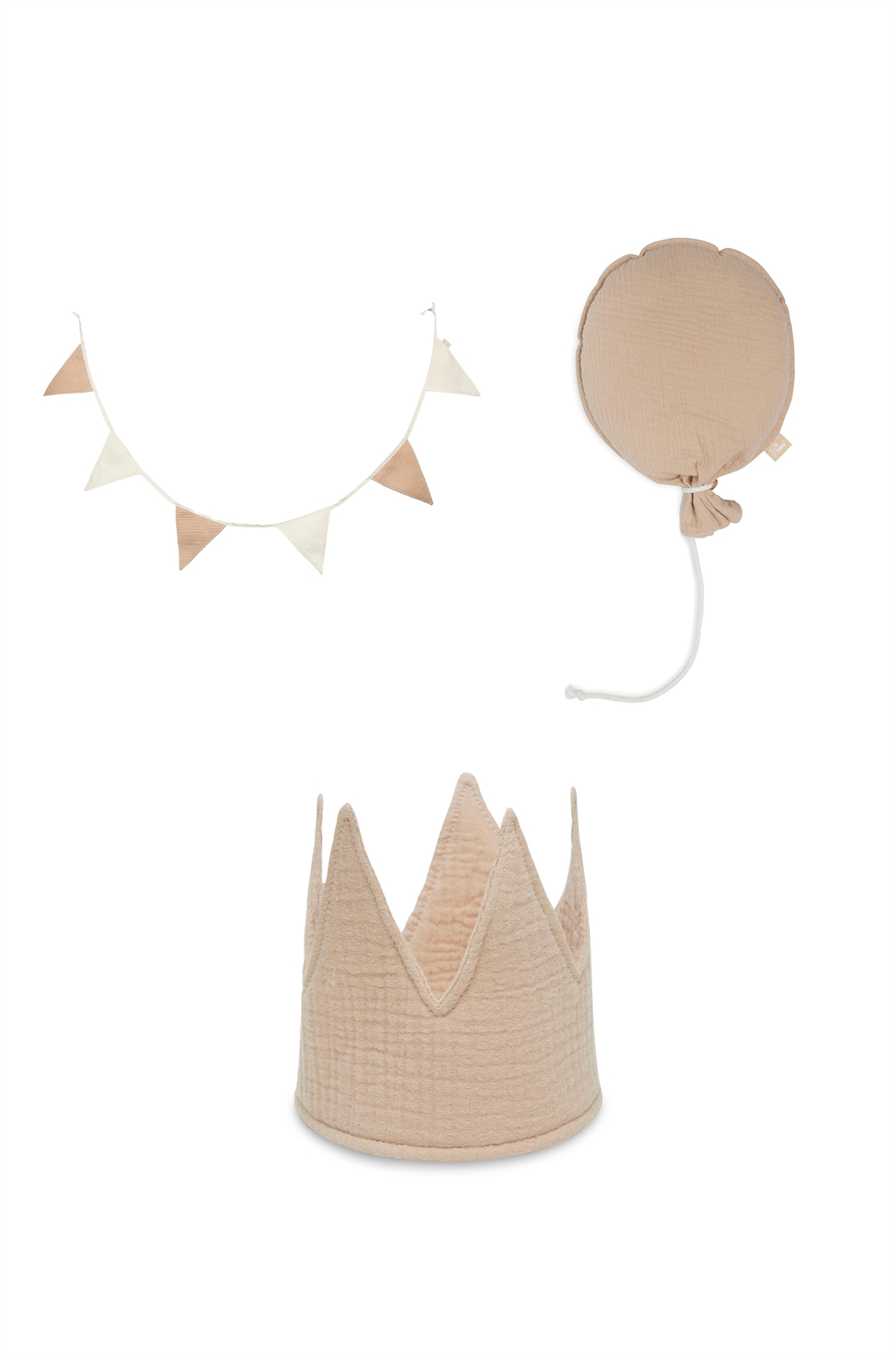 Давайте праздновать! С этим веселым набором для вечеринки из ткани это обязательно произойдет. В этом наборе вы найдете корону, воздушный шар и флажок. Тканевую корону можно связать сзади шнурком. Это делает ее подходящей для детей разного возраста. Тканевый воздушный шар привлекает внимание в детской комнате. Наполнитель шара снимается, а сзади есть петелька для подвешивания. Линия флагов длиной 200 см состоит из 6 тканевых флажков. С обеих сторон имеется шнурок длиной 20 см для подвешивания флага. Отлично подойдет для украшения детской комнаты или игровой.