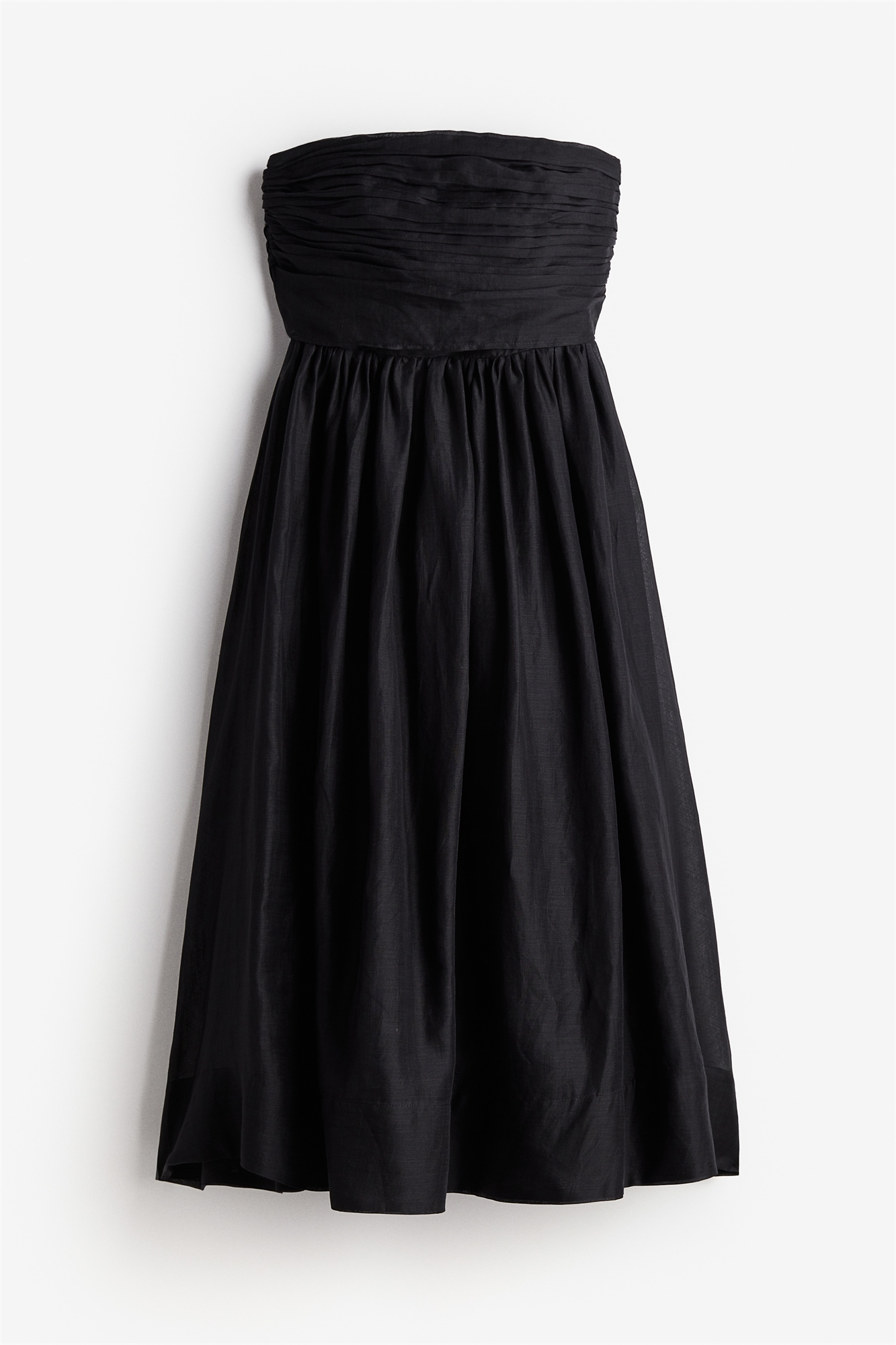 Платье-бандо длиной до колен из воздушной ткани рами. Драпированный приталенный лиф со скрытой силиконовой отделкой в верхней части и длинными струящимися завязками, застегивающимися на бант сзади. Съемные регулируемые бретели. Потайная застежка-молния сзади, сборки на талии и объемная, расклешенная юбка. Хлопковая подкладка.