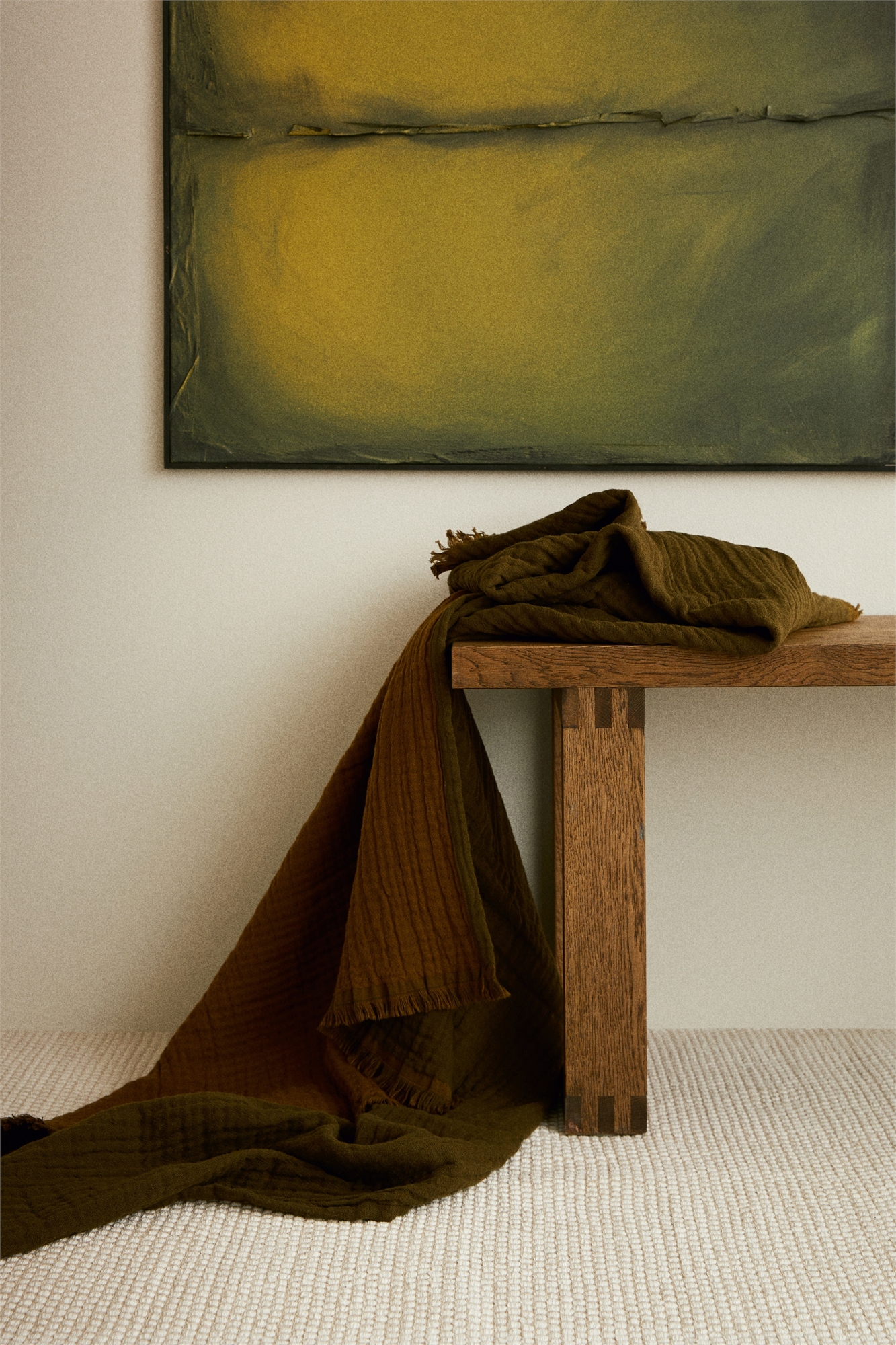 Уютный плед из хлопкового муслина с короткой бахромой по всему периметру.