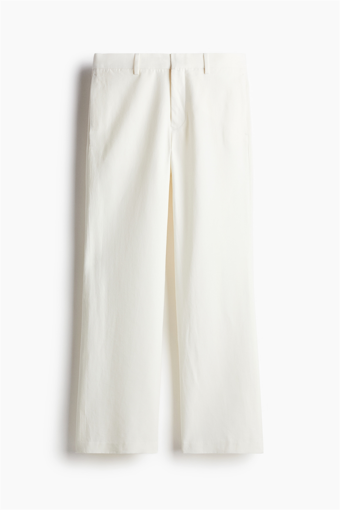 Брюки из воздушного хлопка и льняного полотна со скрытой застежкой на крючок и глазок и ширинкой на молнии. Боковые карманы, втачные задние карманы на пуговице и расклешенные ноги. Регулярный крой для комфортного ношения и классического силуэта. Смесь хлопка и льна сочетает в себе мягкость хлопка и прочность льна, создавая красивую, текстурированную ткань, которая хорошо пропускает воздух и прекрасно драпируется.