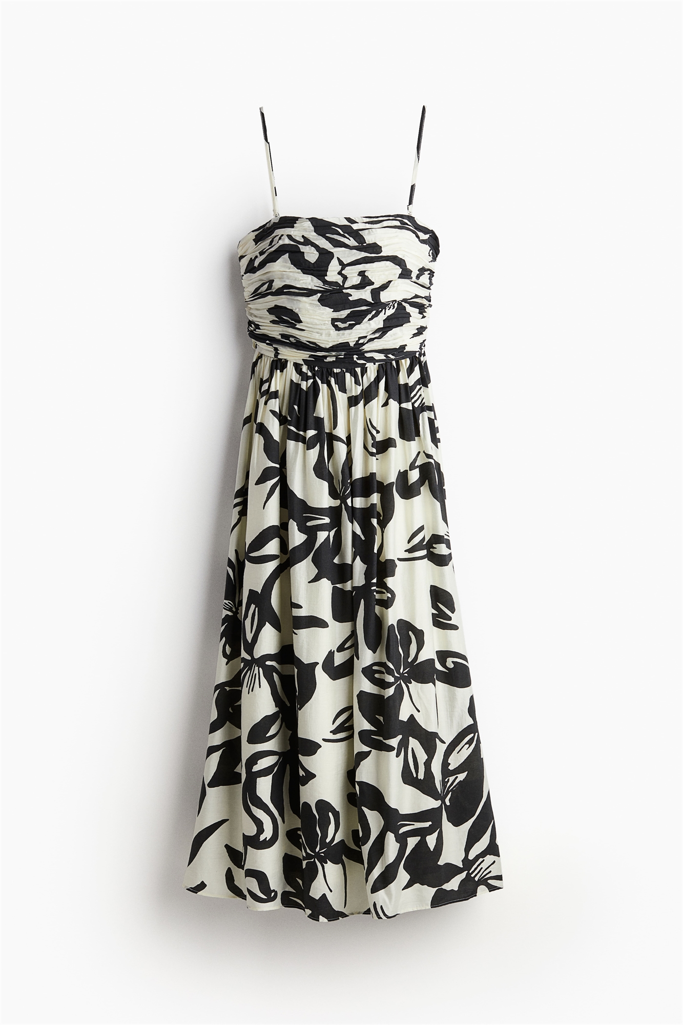 Приталенное платье-бандо длиной до колен из воздушной ткани с драпированным лифом со скрытой силиконовой отделкой в верхней части и длинными струящимися завязками, застегивающимися на бант сзади. Сборки на талии, объемная, расклешенная юбка и потайная застежка-молния сзади. Съемные регулируемые бретели. Хлопковая подкладка.