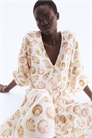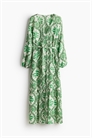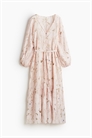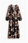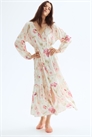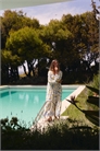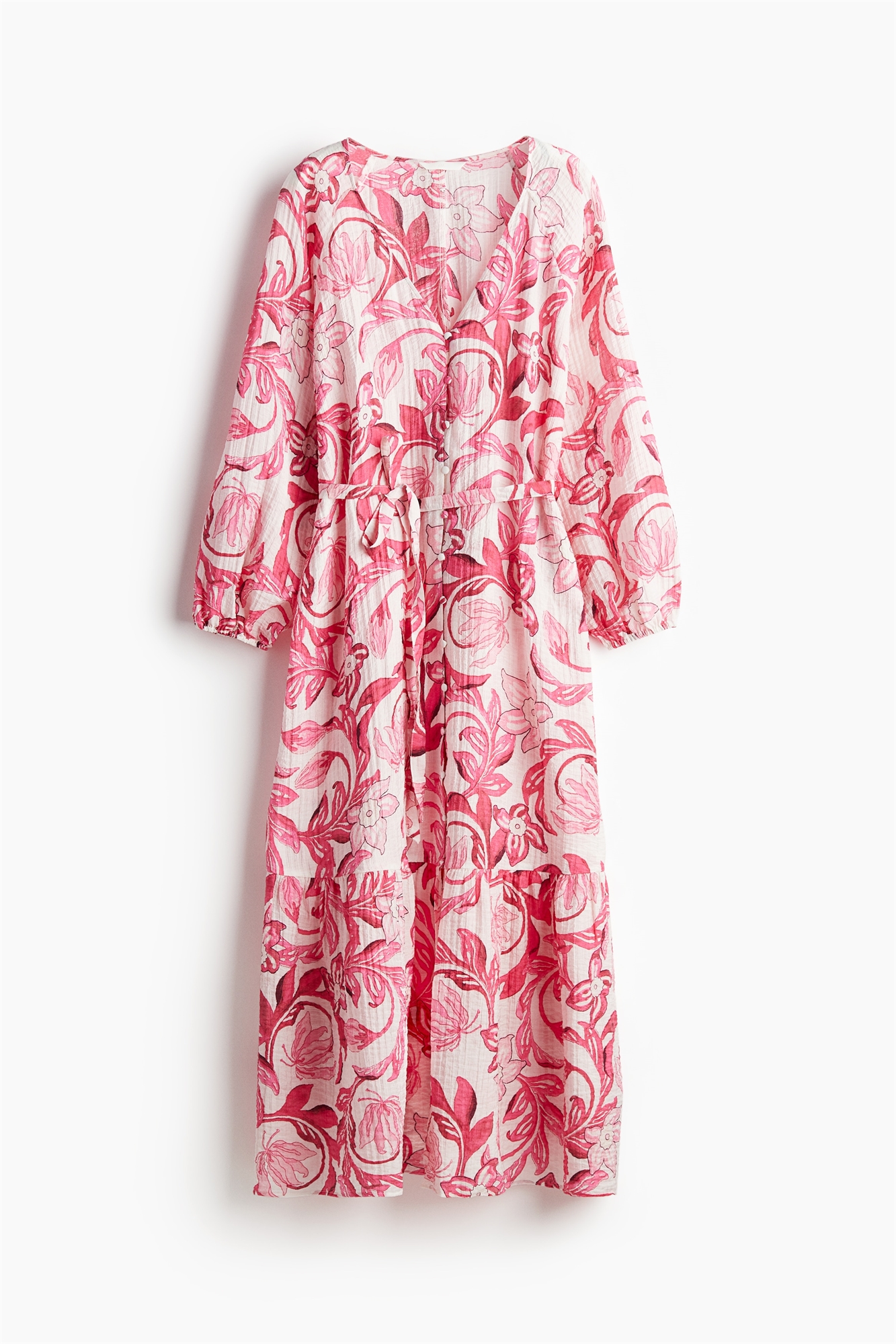 Платье длиной до щиколоток из крепа с V-образным вырезом, застежкой на пуговицы спереди и съемным поясом-завязкой на талии. Длинные рукава-баллоны покроя реглан с узкими эластичными манжетами. Ярусная сборка над подолом для придания дополнительного объема. Без отделки.