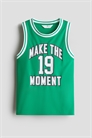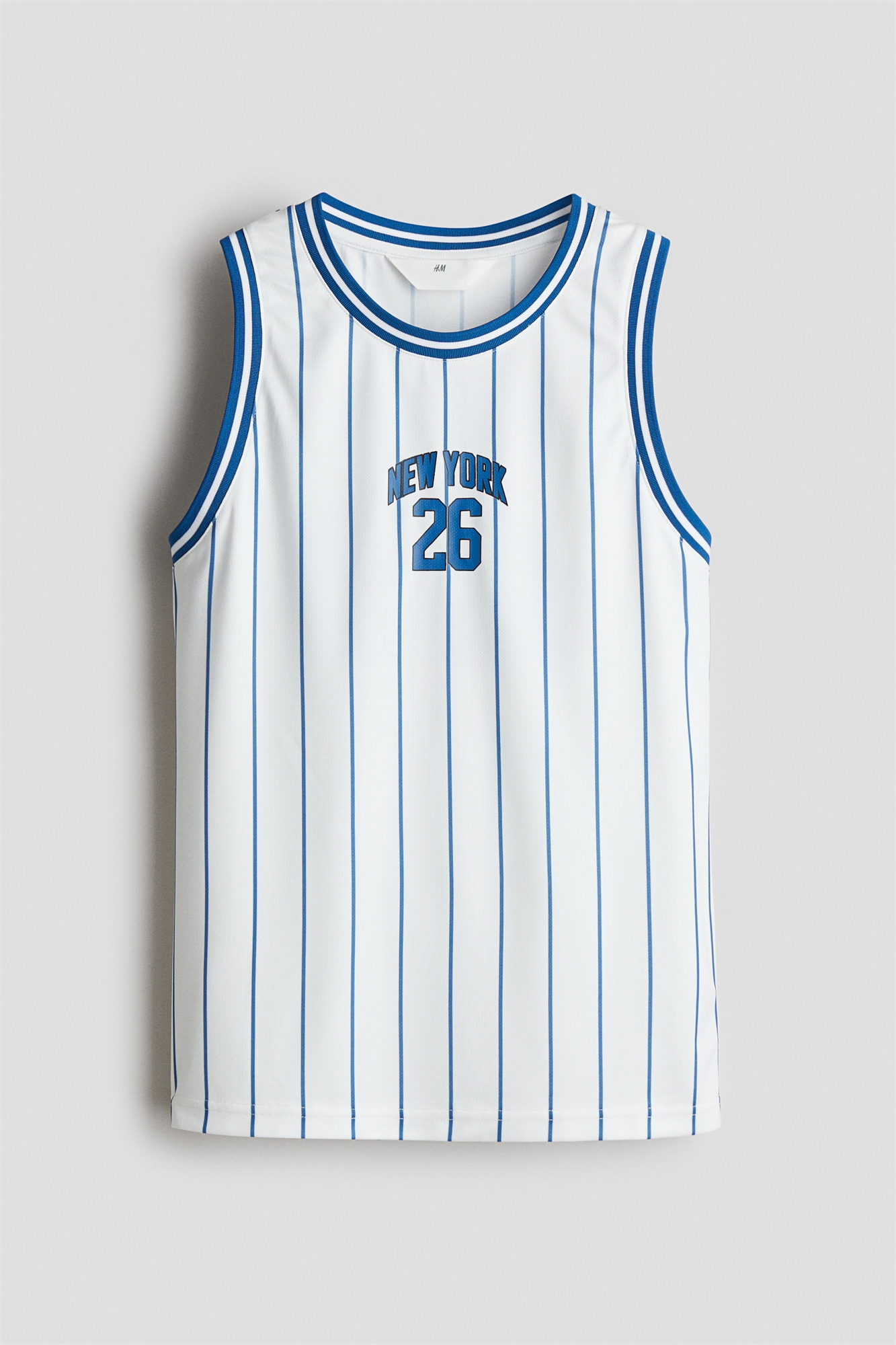 Свободный жилет в баскетбольном стиле из сетки с принтом спереди. Окантовка по вырезу горловины и проймам.