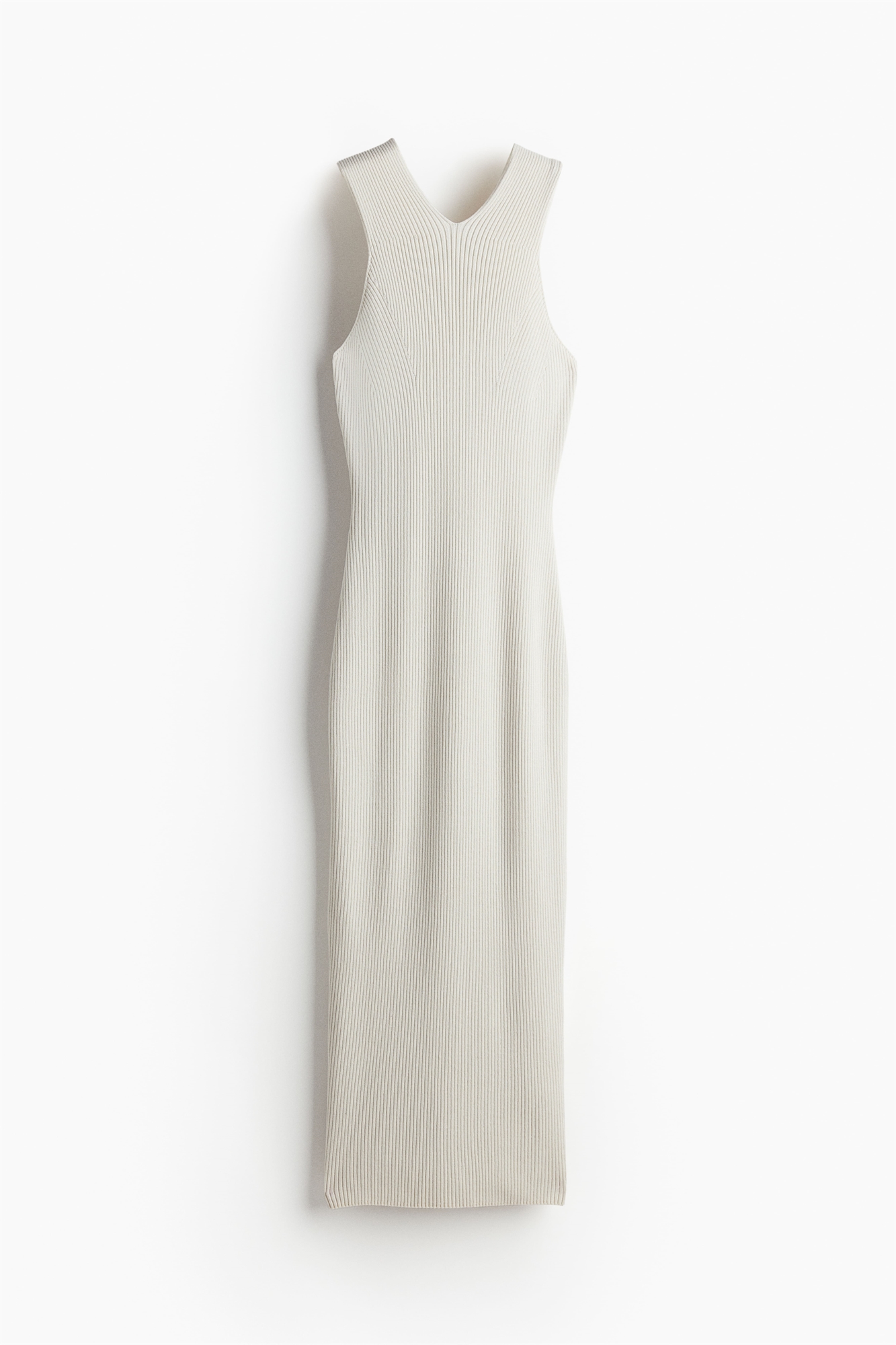 Приталенное платье длиной до колен из трикотажа в рубчик с узким разрезом в верхней части, широкими бретелями и V-образным вырезом.