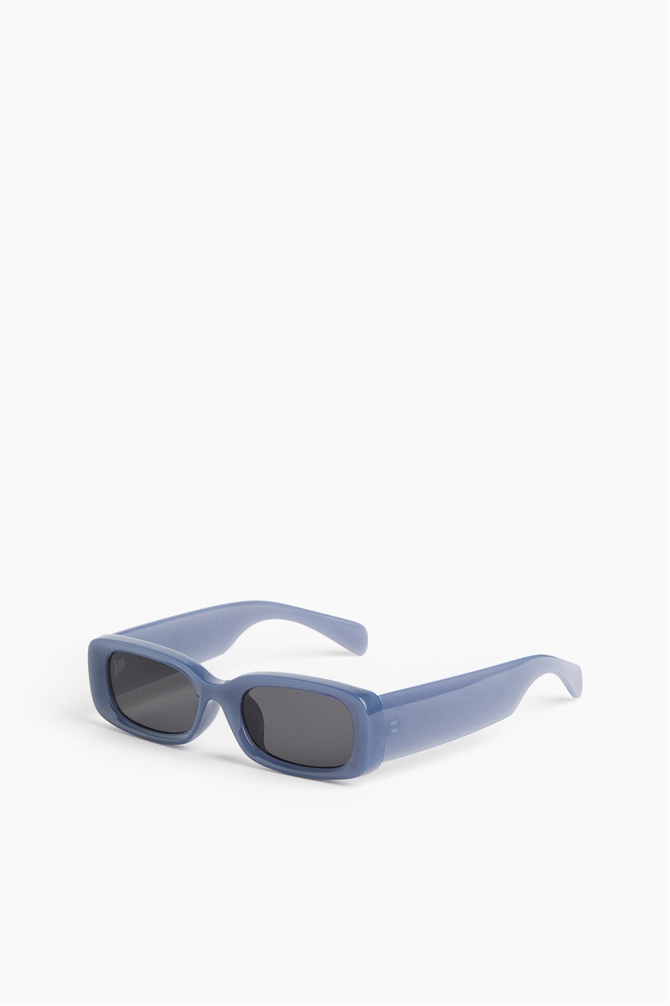 Прямоугольные солнцезащитные очки с пластиковой оправой и боковыми дужками. Тонированные пластиковые линзы с УФ-защитой.