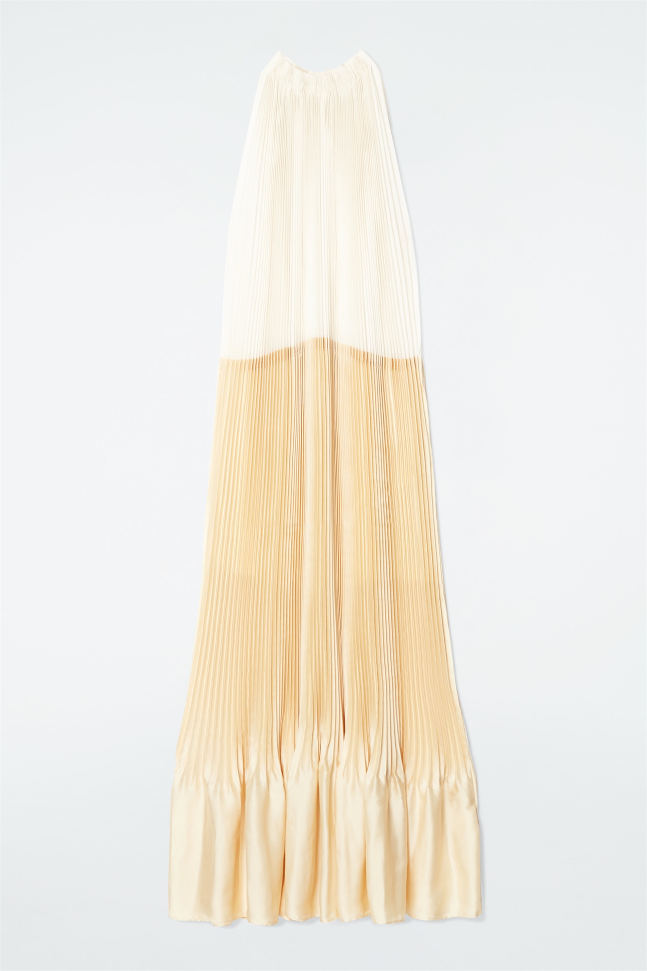 Это современное платье макси привлекательного цвета шампанского и желтого добавит особый штрих к вашим нарядам для летних мероприятий. Оно имеет характерные складки-аккордеоны для придания объема и структуры, а также сборчатый вырез с лазерной резкой по краям. Носите с туфлями на высоком каблуке или балеринами. Свободный крой Застежка на крючок и глазок Лучшая альтернатива обычному полиэстеру: переработанный полиэстер изготавливается из отходов до и после переработки Внешний материал и подкладка: 100% переработанный полиэстер. Детали исключены/Машинная стирка Длина по спинке в размере 36 = 144 см/Модель носит размер 36
