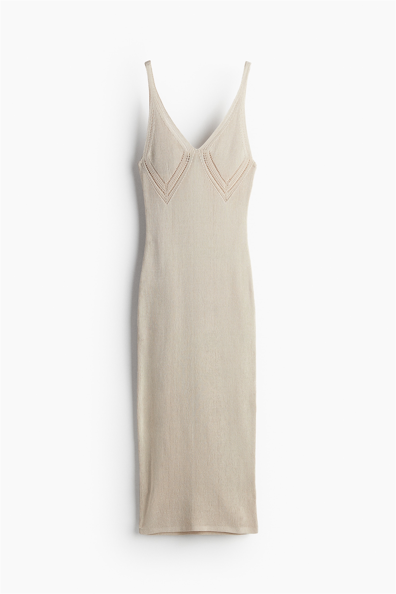 Приталенное платье из трикотажа длиной до колен с глубоким V-образным вырезом, чашечками из пуантелье, узкими бретелями и круглым вырезом сзади.