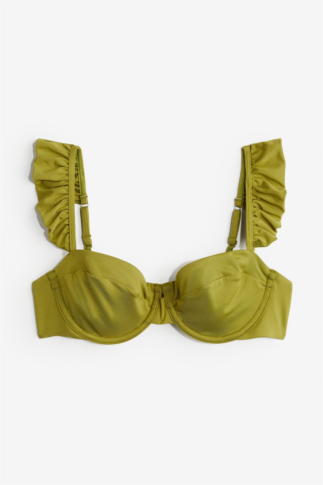 Бикини без подкладки, с регулируемыми бретелями со складками и чашечками с заниженной талией, которые придают бюсту естественную форму и обеспечивают легкую поддержку. Регулируемая застежка-крючок сзади.